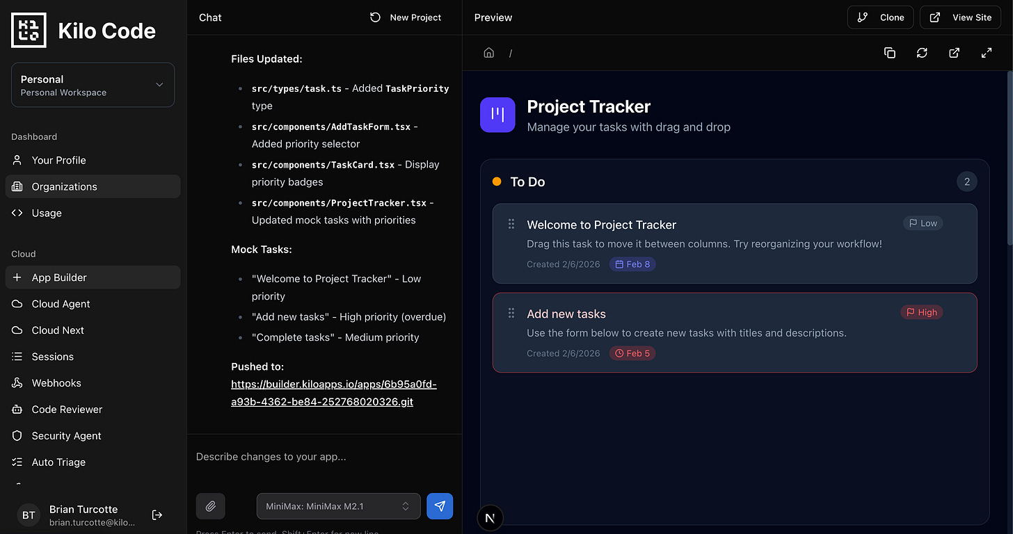 App Builder eliminates the entire “getting started” phase. No repo setup, no dependency management, no deployment pipeline. Describe your app, iterate in real-time, deploy when you’re ready. If you hit a wall and need to drop into more powerful tooling, the code exports directly into Kilo’s IDE or CLI where you can spin up parallel agents and move even faster.