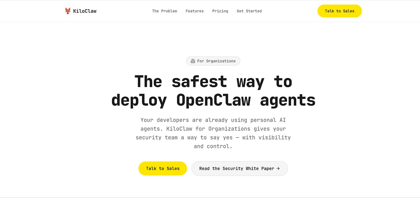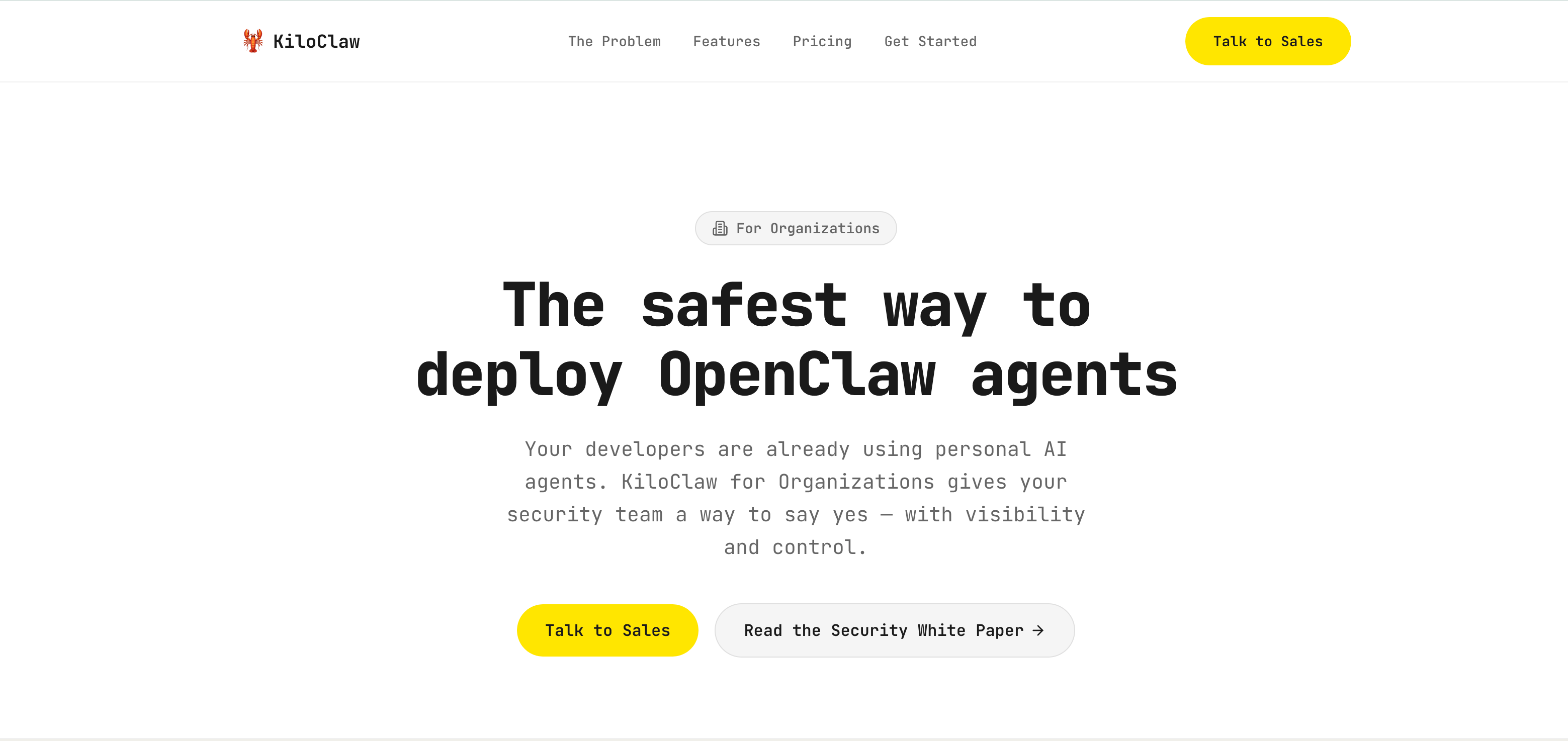 Blocking agents won’t work. Your developers are already using them. KiloClaw for Organizations gives your security team a way to say yes — with the visibility and control they actually need. And KiloClaw “yes” can extend to everyone in your organization, not just the engineers who know how to configure an OpenClaw instance.