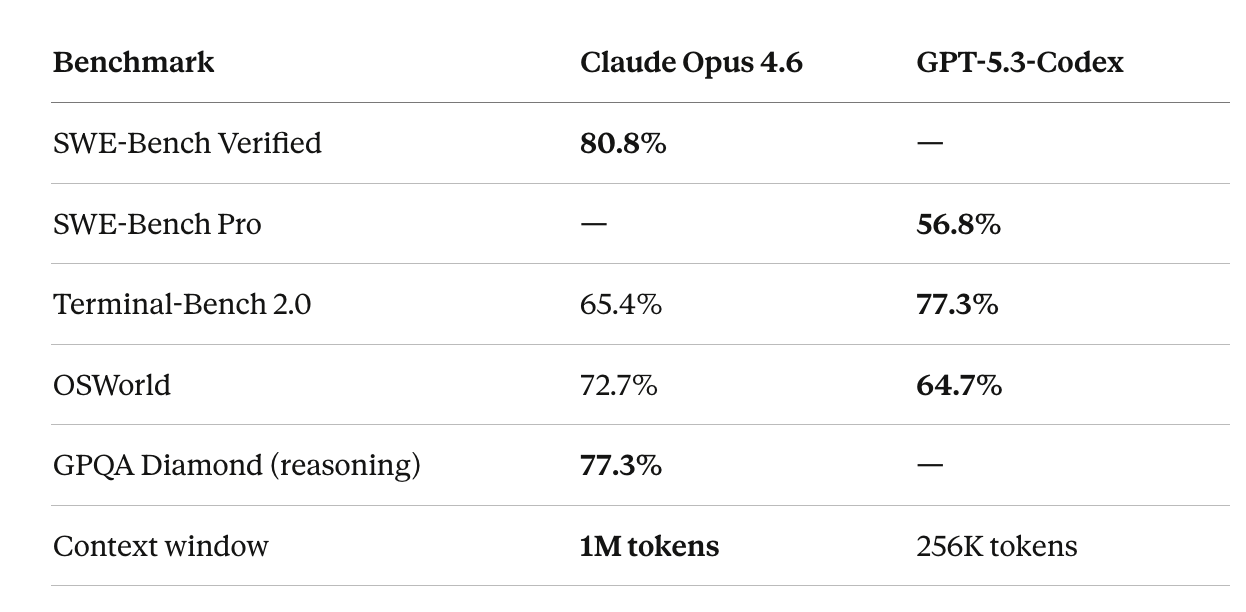 With Opus 4.6 and GPT 5.3 Codex, the benchmark comparison tells a clear story — not of one model dominating, but of two models excelling in different dimensions.