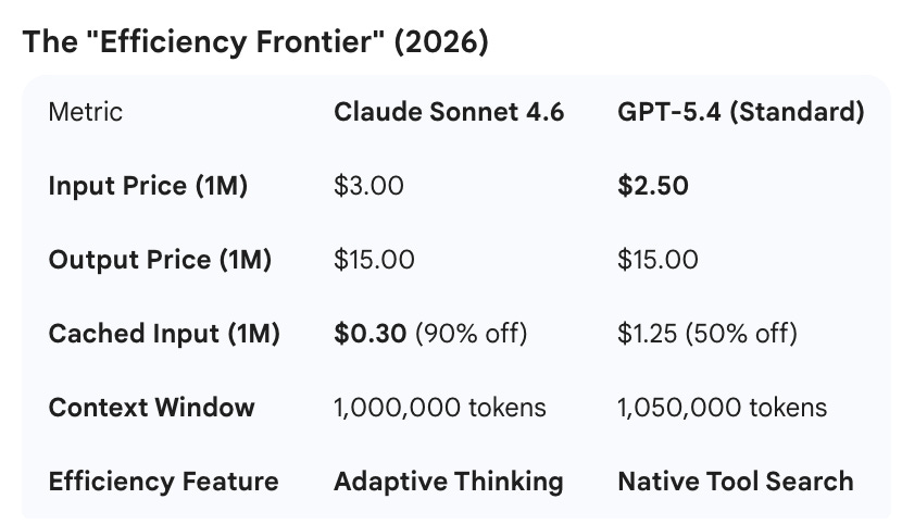 We’ve seen an increase of around 40% cost savings for Anthropic model devotees with the new Sonnet (it has “Opus-like” reasoning now). Will we see the same with OpenAI? At $2.50/1M tokens, GPT-5.4 is currently the most affordable “frontier-class” flagship, but note that for prompts over 272K tokens, GPT-5.4’s input rate doubles to $5.00.