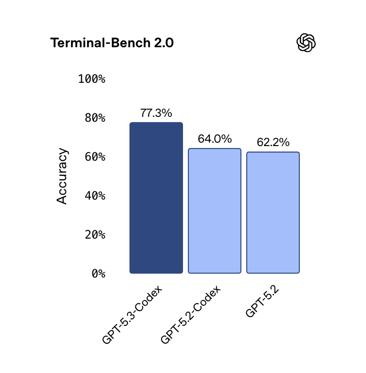 77.3% on Terminal-Bench 2.0 — a massive 13-point leap over GPT-5.2, immediately reclaiming the top spot from Opus 4.6