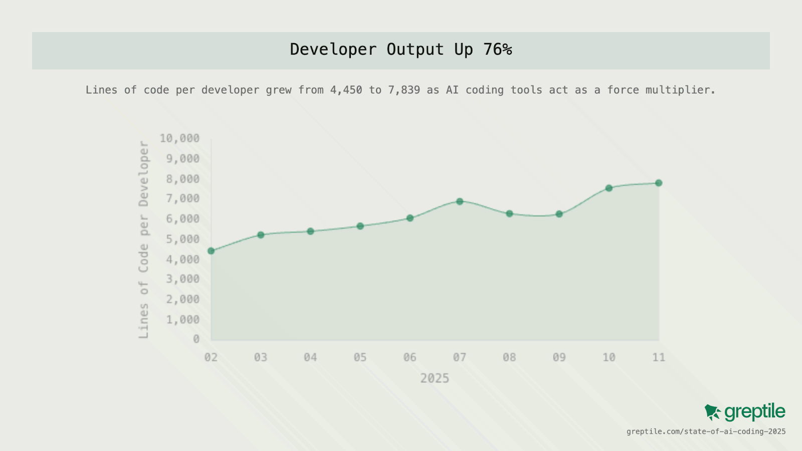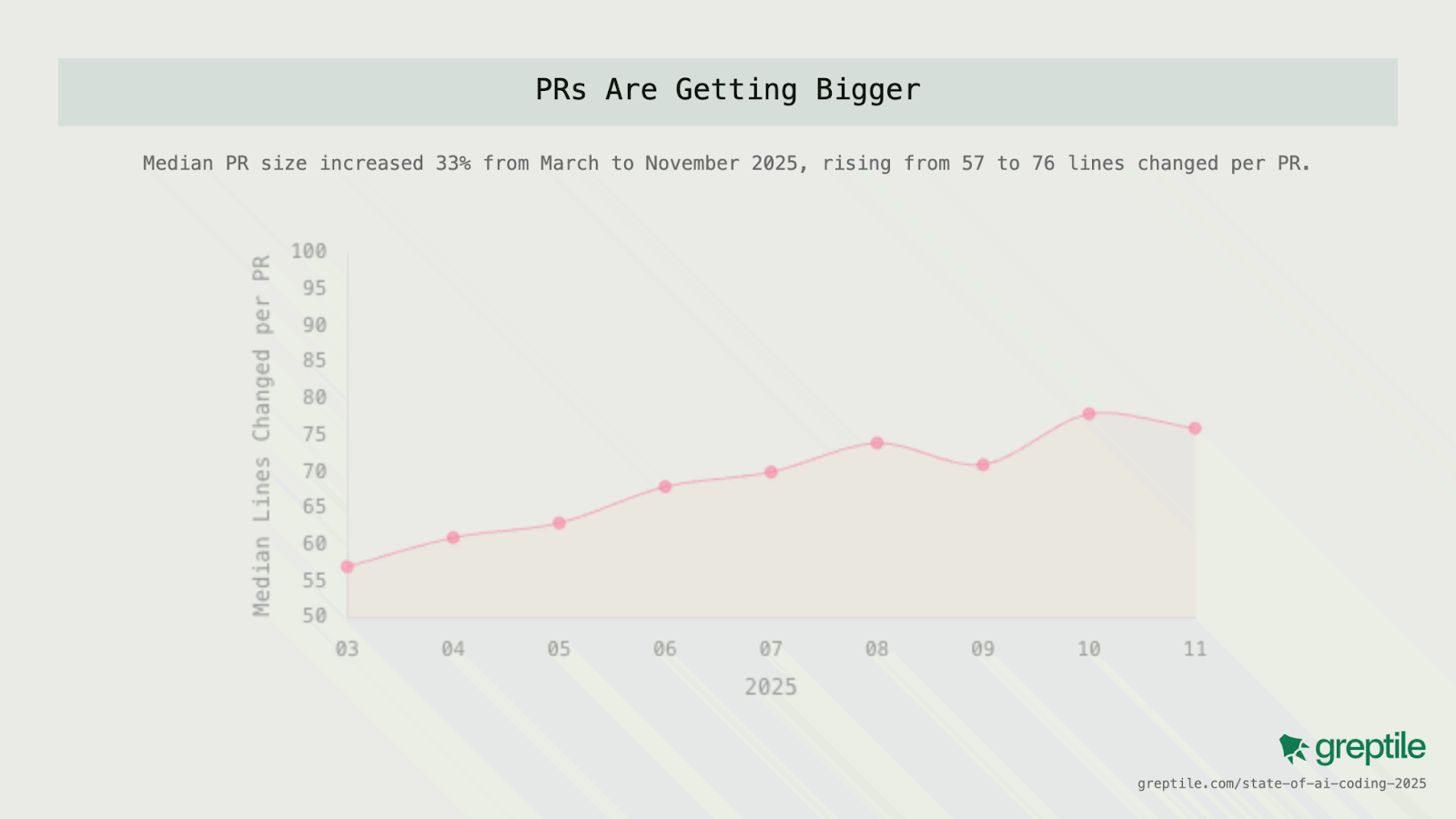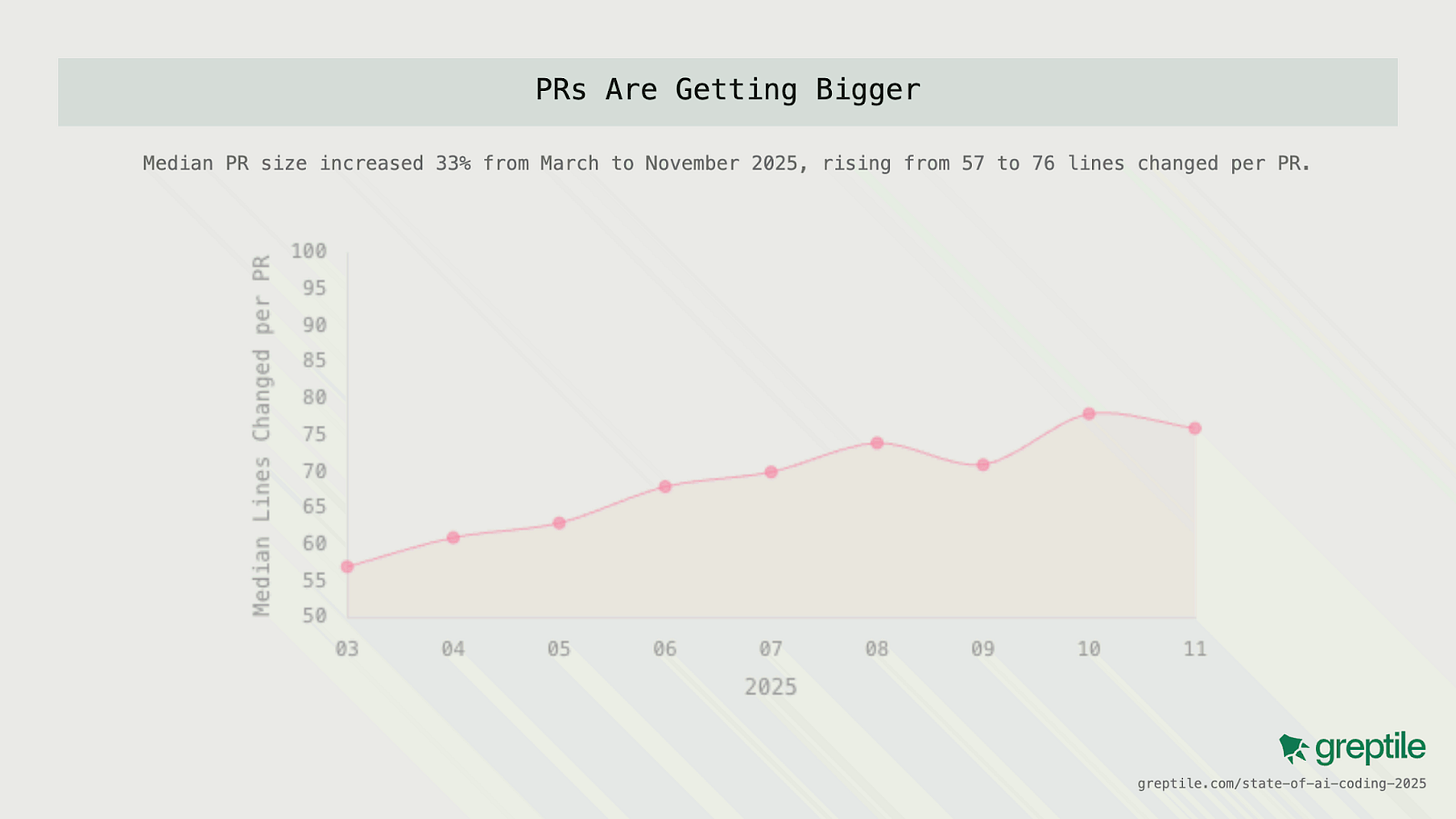 Greptile’s State of AI Coding 2025 report shows developer output up 76% year-over-year. Lines of code per developer grew from 4,450 to 7,839 as AI tools acted as a force multiplier. At the same time, median PR size increased by 33%, from 57 to 76 lines changed per PR.