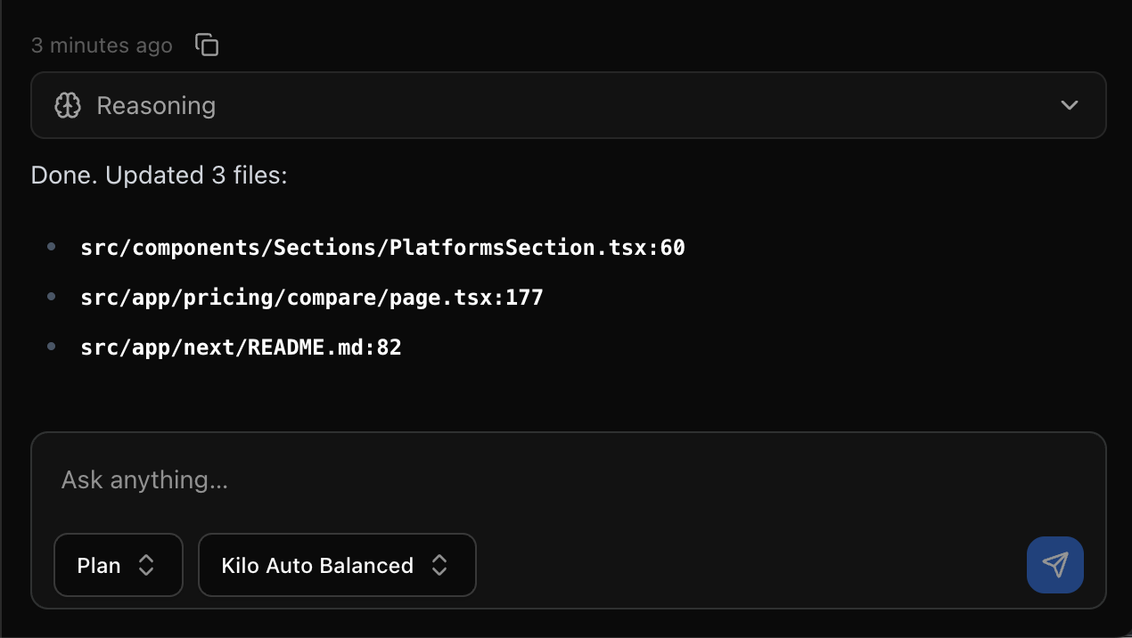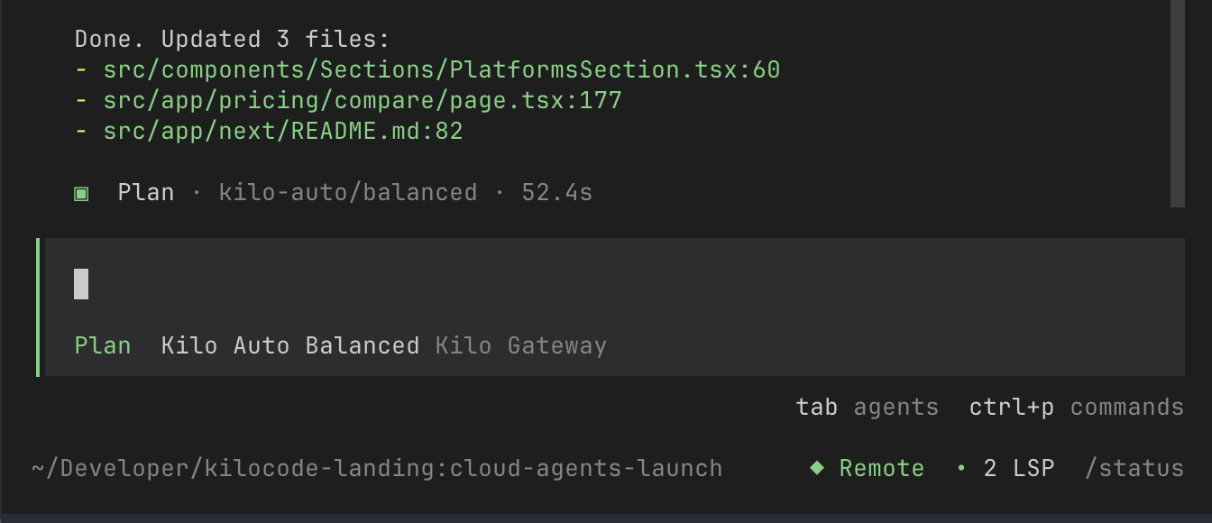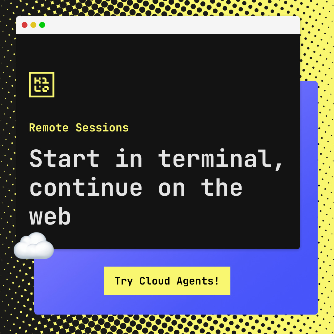 Or start a session locally in the Kilo CLI, run /remote, and watch it become accessible from the cloud dashboard