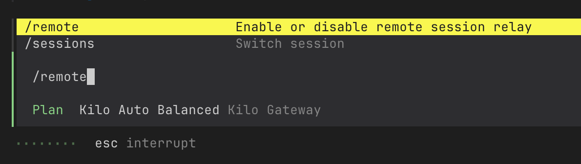 The classic scenario: you start a session in the Kilo CLI, need to leave your desk, enable remote mode with /remote, and suddenly you can check in on that session from your phone or browser — watching it progress, answering questions, without being tied to your machine.