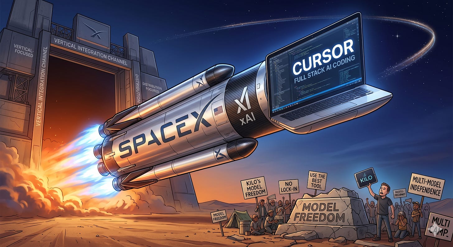 SpaceX has an AI strategy. It’s called xAI. They spent $1.25 trillion worth of equity absorbing it in February. You don’t make that bet and then happily route Cursor users to Anthropic’s models. You route them to Grok. You fund xAI’s next release. You use Cursor as a growth lever for the model you already own. That’s just how businesses work.
