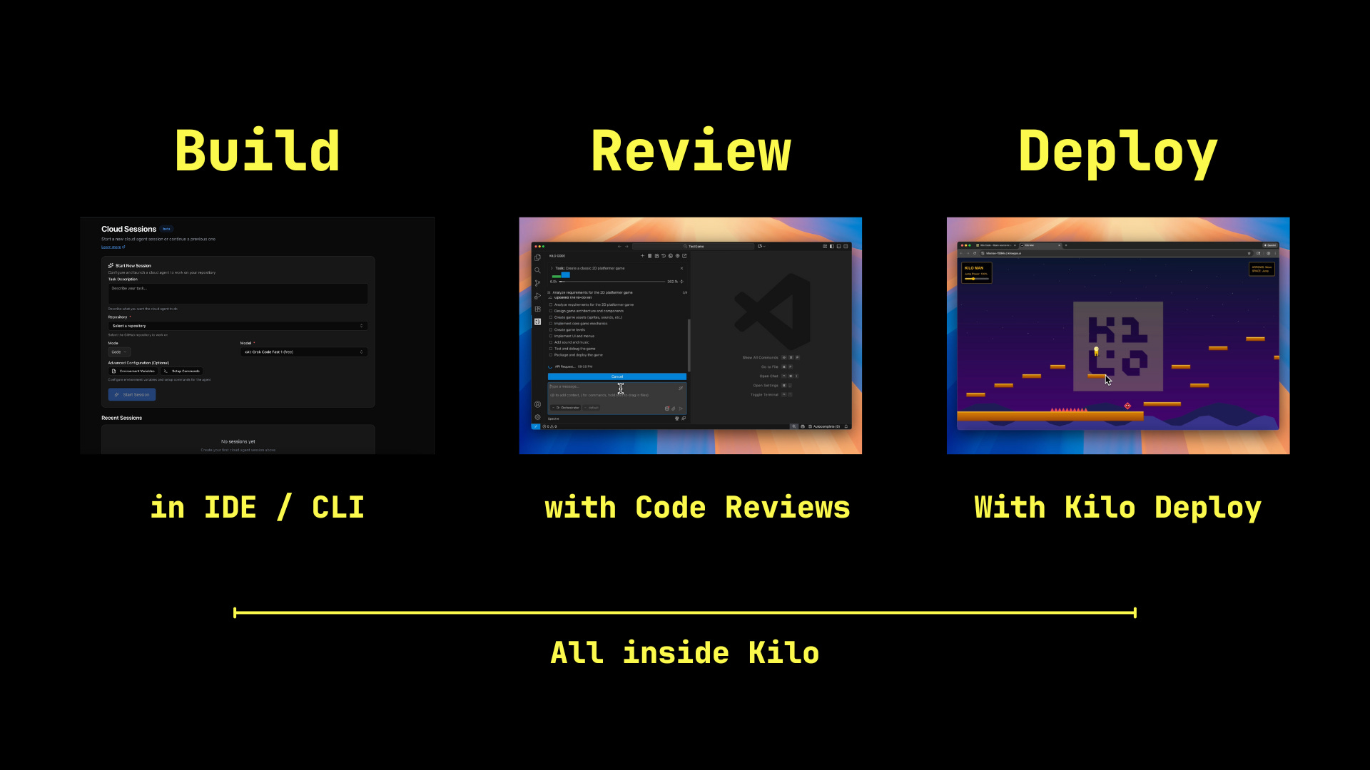 Context flows naturally. The AI that reviews your code understands how it was written. Issues flagged in review can inform your next coding session. When you’re ready to ship, deployment is one click away with Kilo Deploy.
