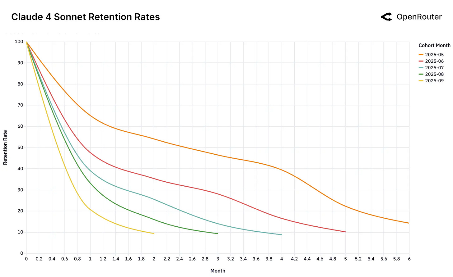 Anthropic’s Claude Sonnet 4 launch is a strong example; they retained roughly 40% of users in the initial “launch cohort” by month 4. The Sonnet series has continued to be highly popular; nonetheless, later cohorts didn’t have the same staying power.