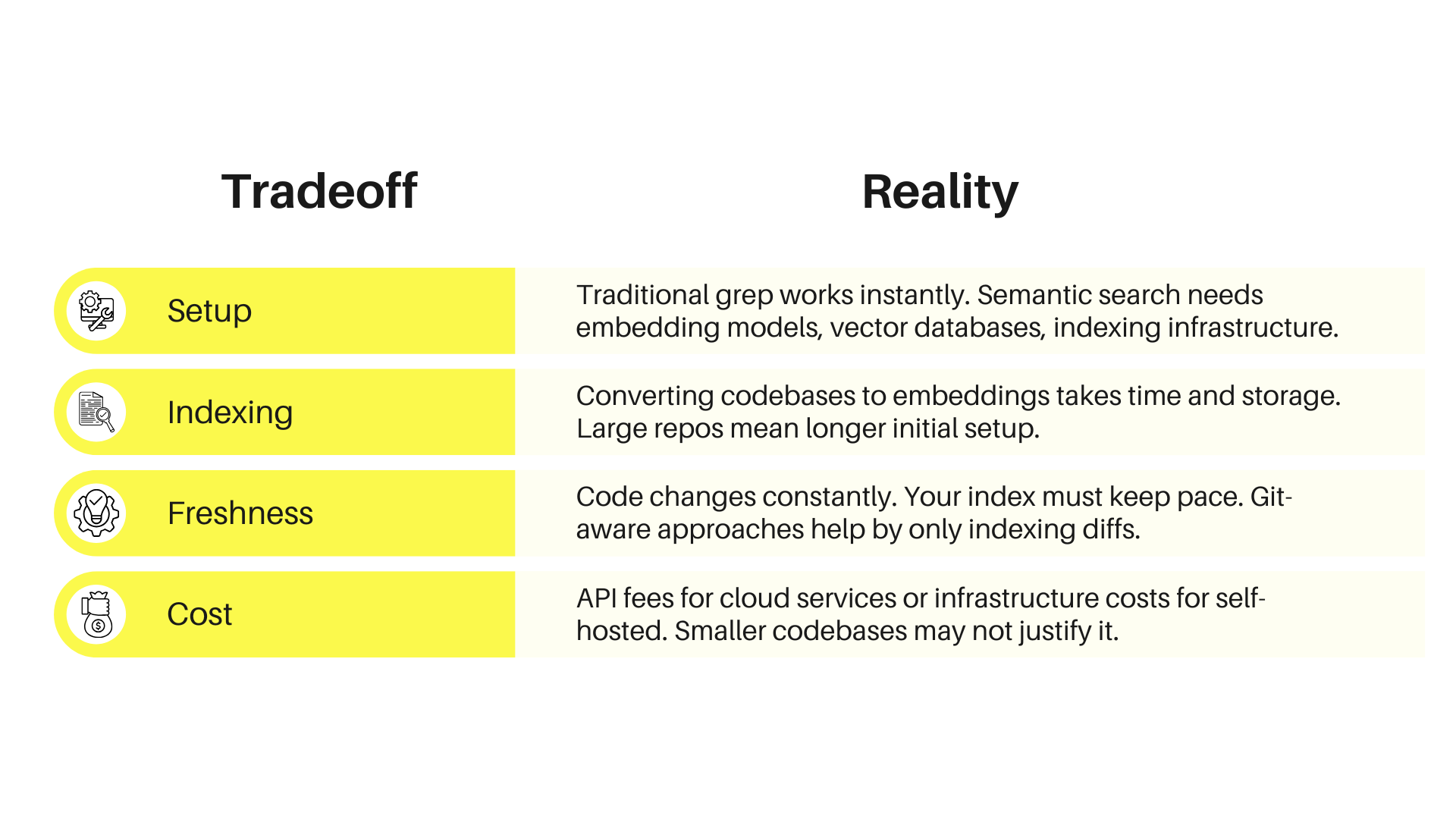 Semantic search transforms how you find code—but it’s not free.
