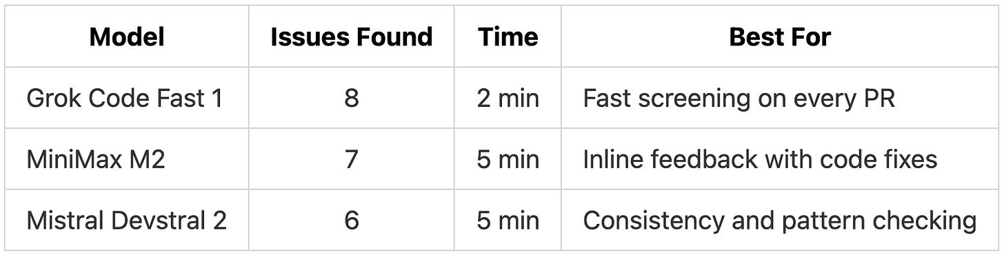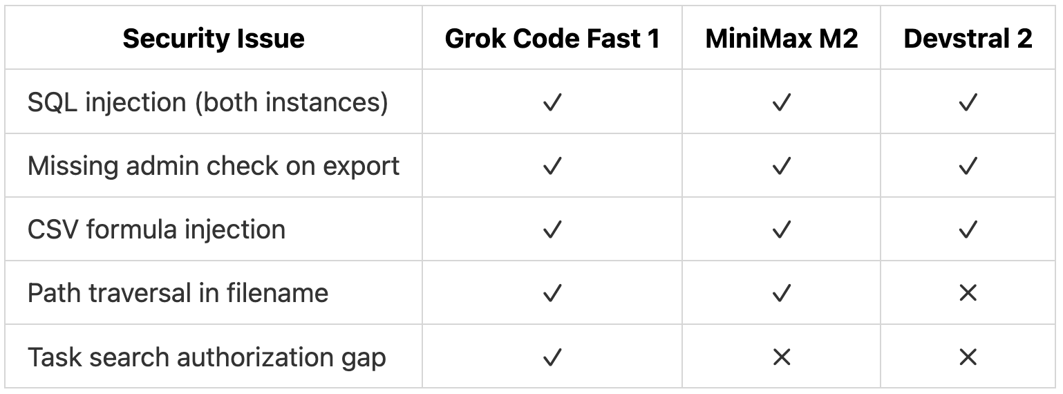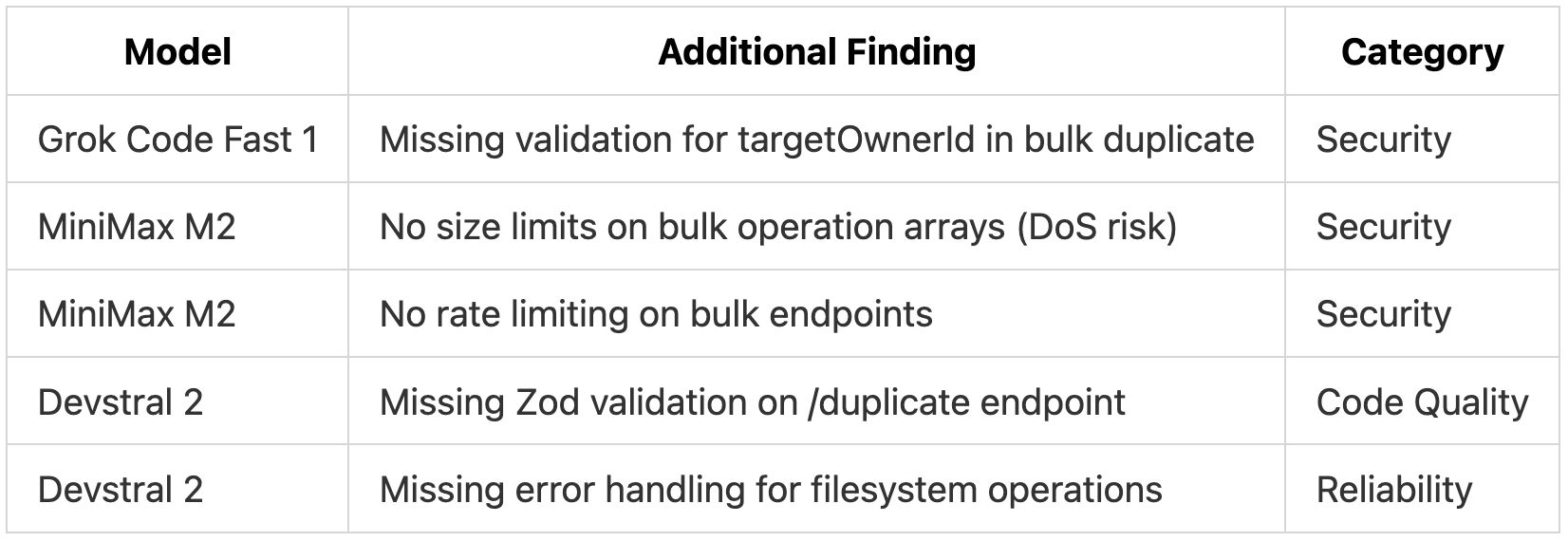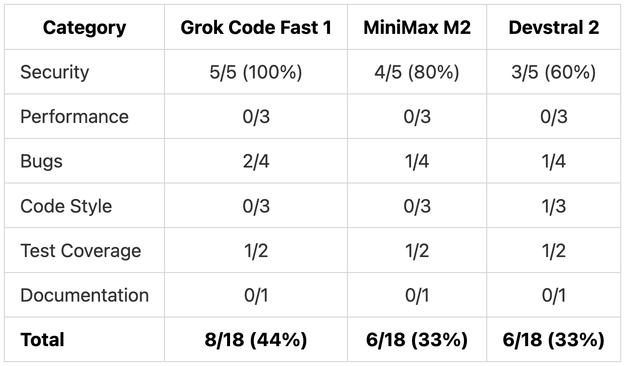 Grok Code Fast 1 caught all five. MiniMax M2 missed the authorization gap where any user could search all tasks. Devstral 2 missed both that and the path traversal vulnerability. The gaps in performance and concurrency detection are expected from smaller models optimized for speed rather than deep reasoning. For security issues, which often carry the highest risk, all three models performed well.