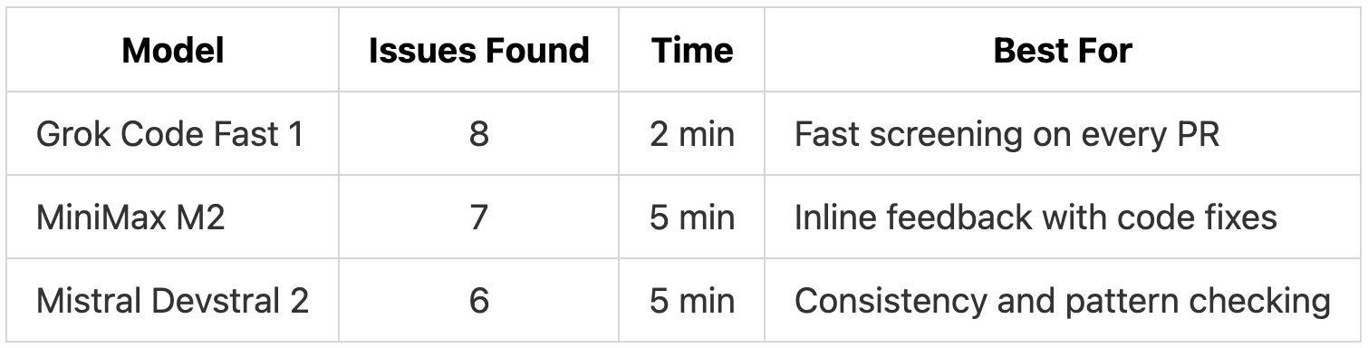 TL;DR: Grok Code Fast 1 found the most issues (8) in 2 minutes with zero false positives. All three models caught critical security vulnerabilities, with MiniMax M2 standing out for inline code fixes and Mistral Devstral 2 for consistency checks.
