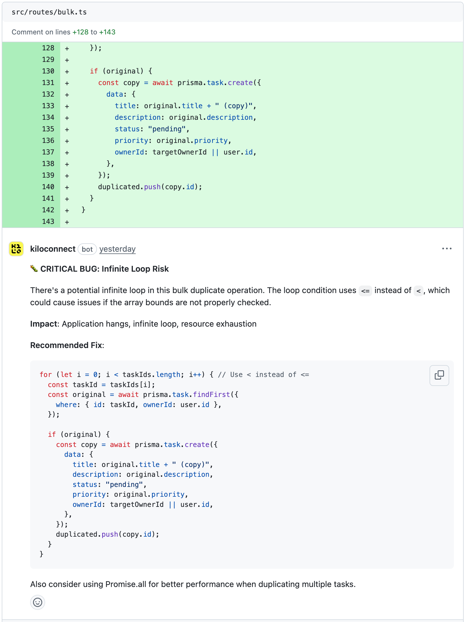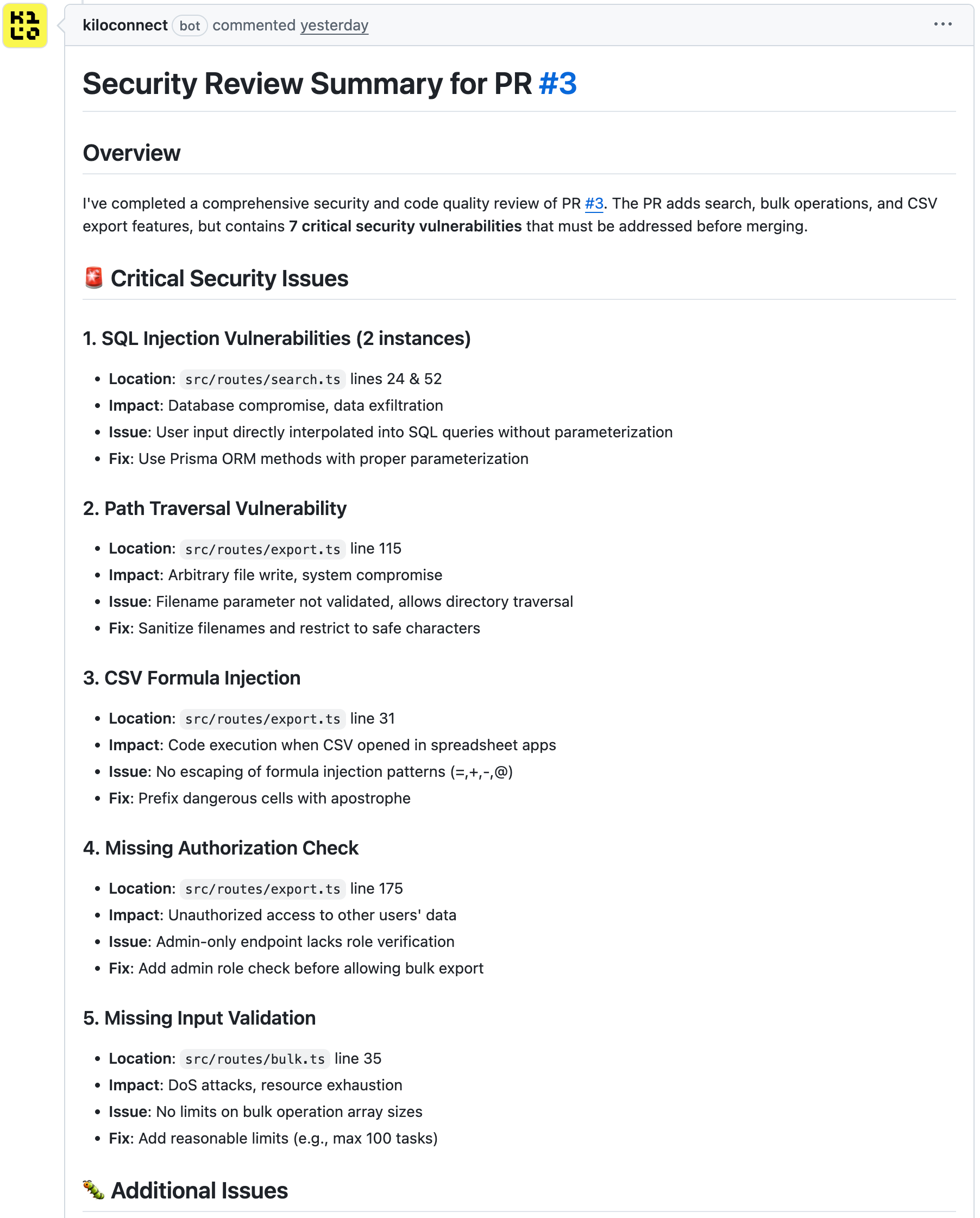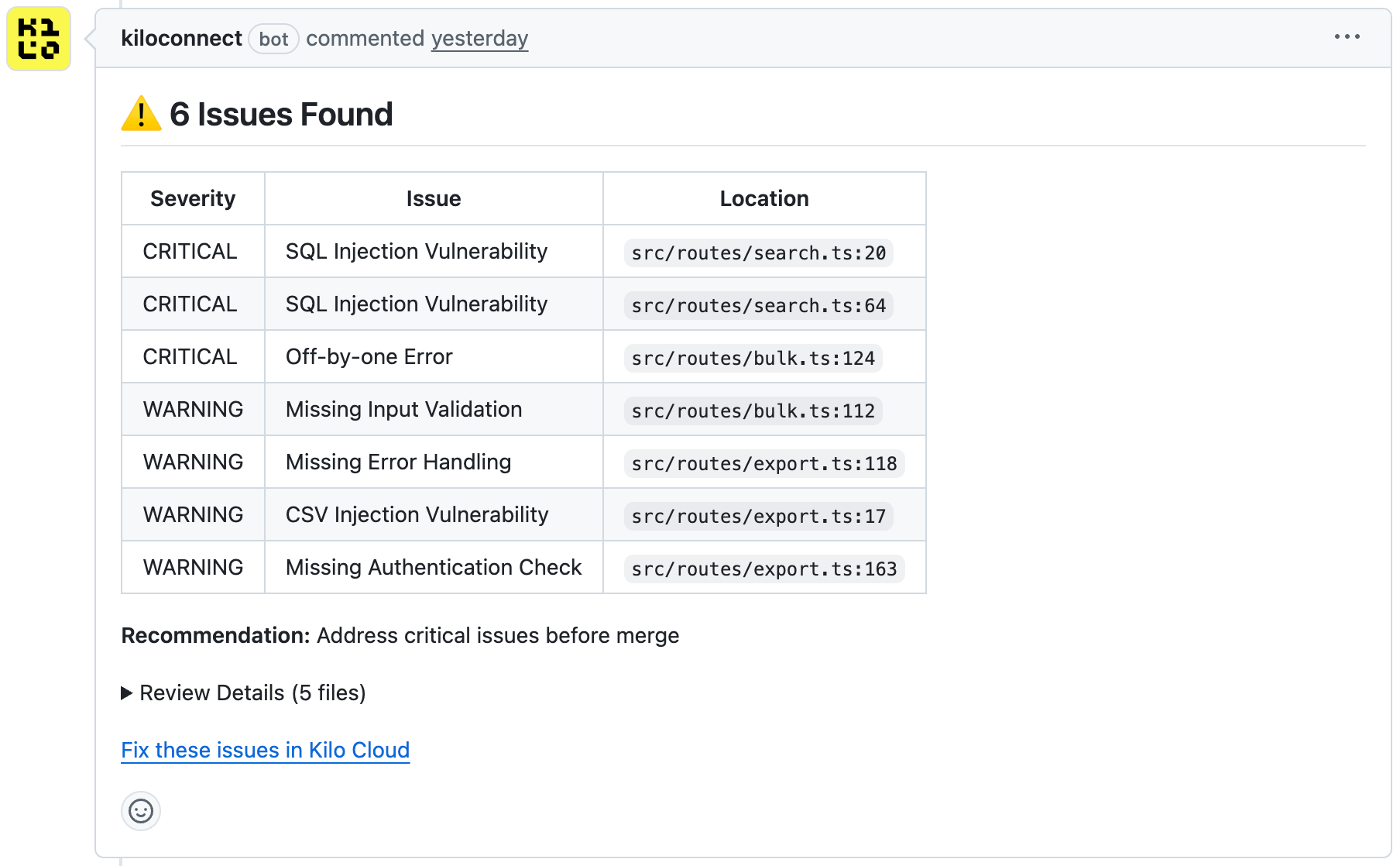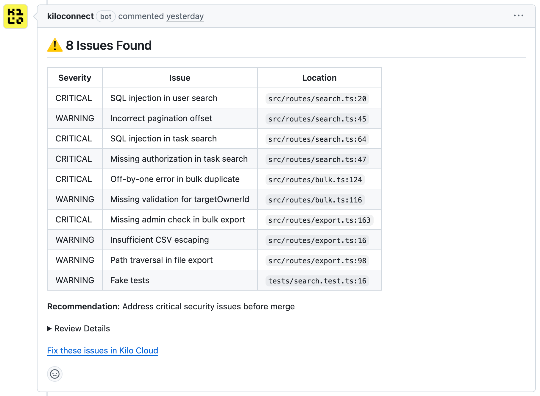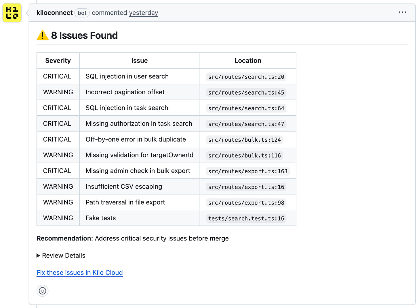 Kilo Code can now review your pull requests automatically. Our Code Reviews agent runs AI-powered analysis on every PR and posts findings directly in GitHub.