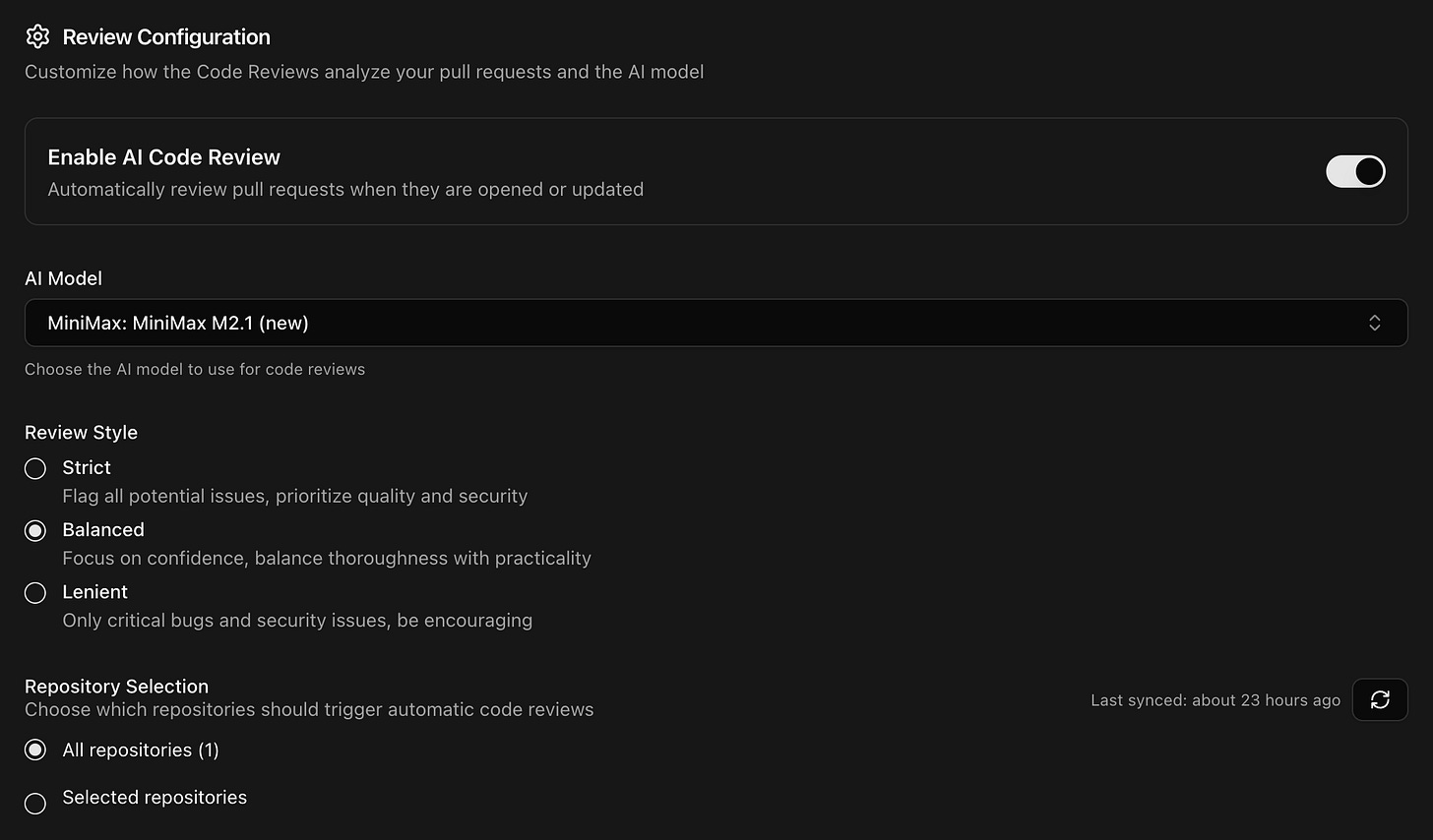 MiniMax M2 fits teams that want actionable inline feedback. The comments appear directly on the code in GitHub with specific fix suggestions. Developers can address issues without context switching. Use it when you want the review to function like a human reviewer leaving comments.