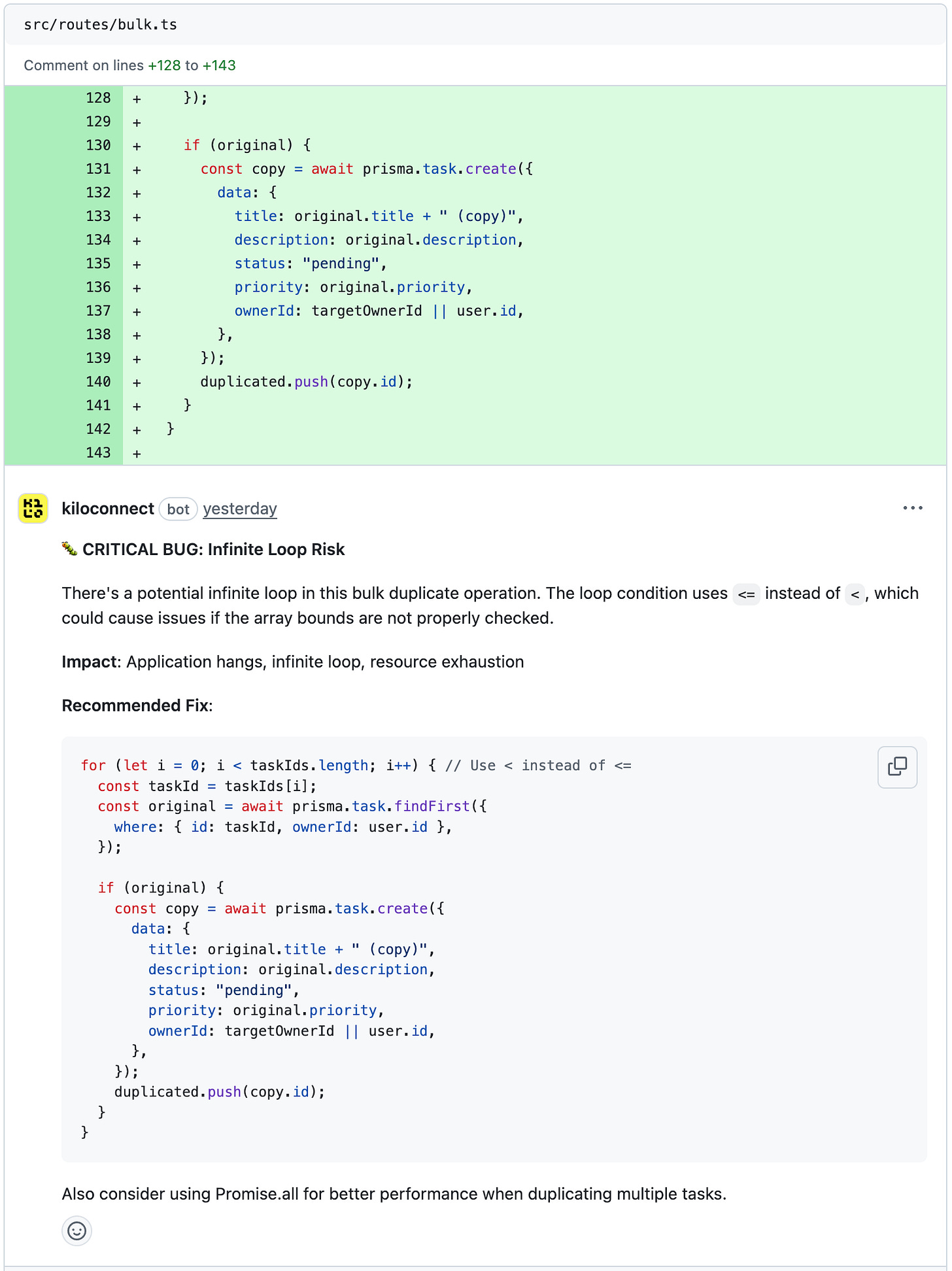 Use a more capable model. Kilo Code supports Claude Opus 4.5, OpenAI GPT-5.2, and other frontier models for code reviews. These larger models catch performance patterns, concurrency bugs, and subtle logic errors that smaller models miss.
