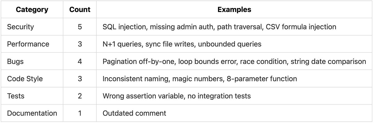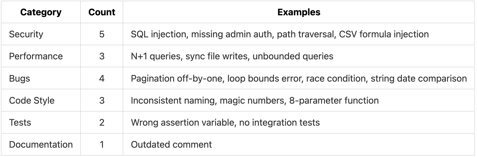 The PR contained 18 intentional issues across six categories. We embedded these issues at varying levels of subtlety: some obvious (like raw SQL queries with string interpolation), some moderate (like incorrect pagination math), and some subtle (like asserting on the wrong variable in a test).