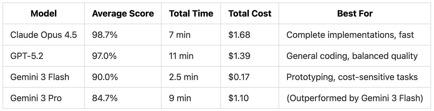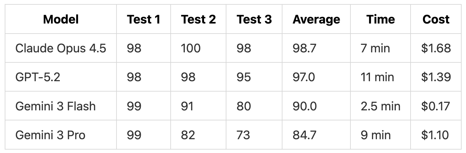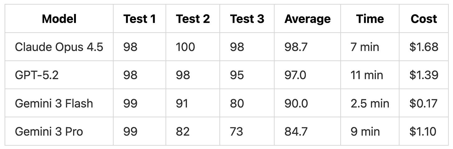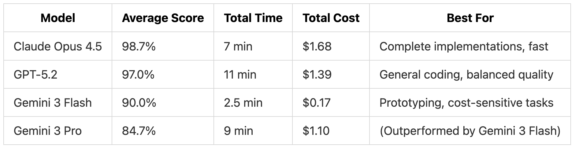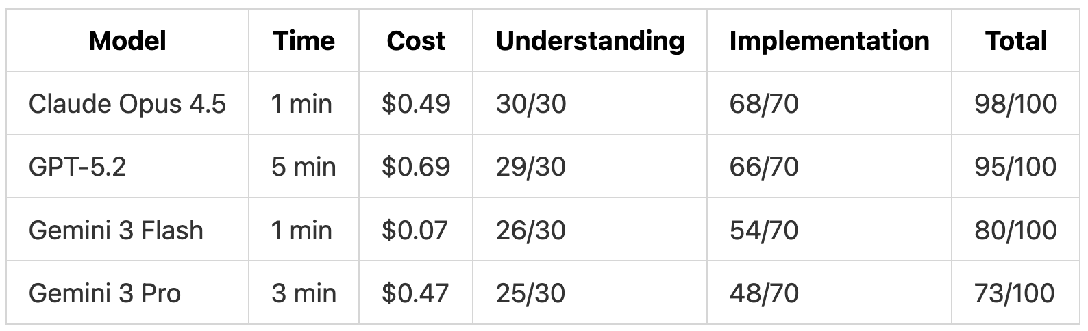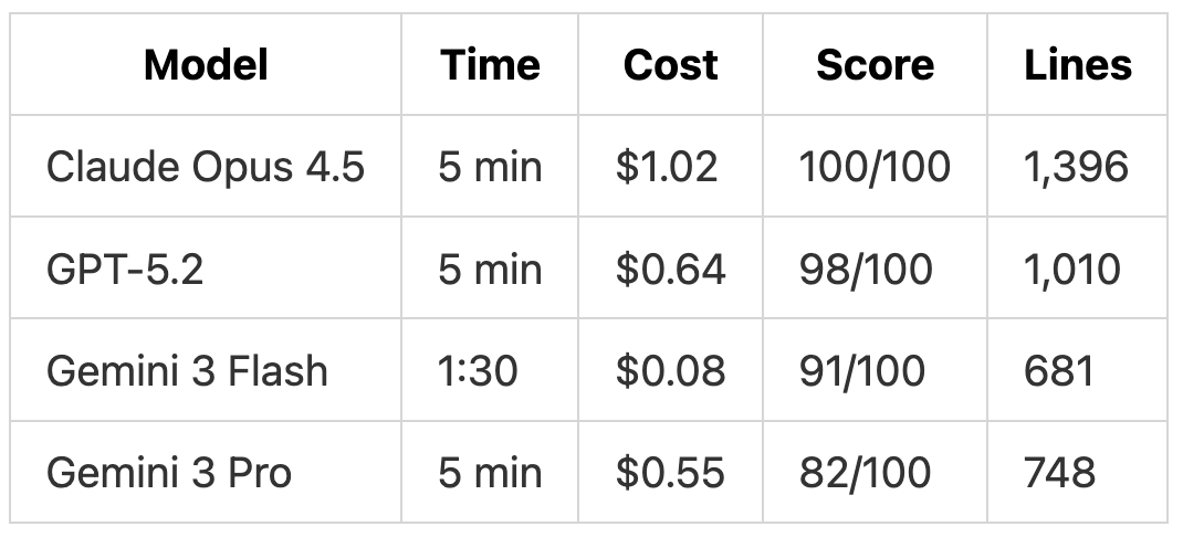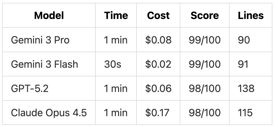 Gemini 3 Flash matched Gemini 3 Pro’s score while completing in half the time at a quarter of the cost. Both Gemini models followed the spec closely and produced the most concise implementations.