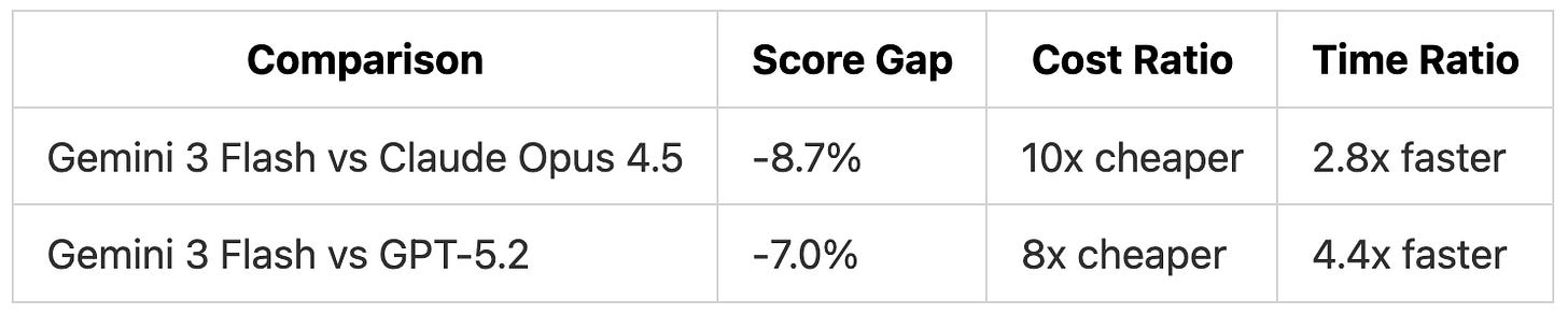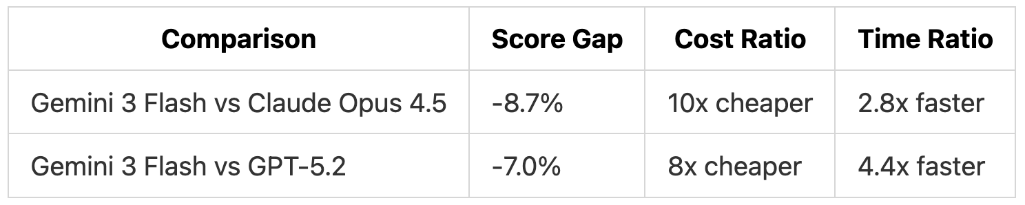 Gemini 3 Flash trails the leading models by 7-9 points: