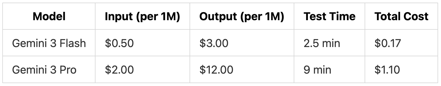 The score gap held across all three challenges on our tests, though other benchmarks or task types may show different results. For developers choosing between Gemini models, Gemini 3 Flash is worth testing first given the 6x cost savings and 3.6x speed advantage.