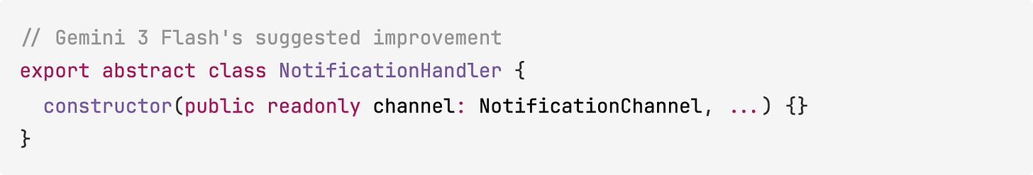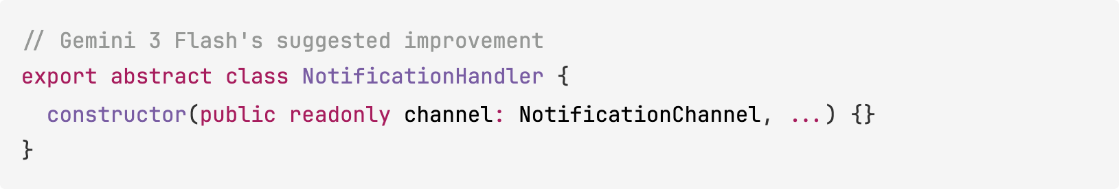 Gemini 3 Flash identified the same architectural issues as more expensive models, including the fragile channel detection using type casting, private property access violations, missing validation during handler registration, and queue bottlenecks.