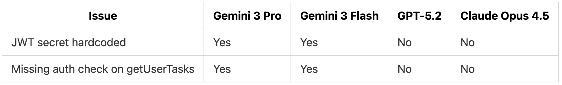 Both hardcode the JWT secret as 'hardcoded-secret-key-123' instead of using environment variables. Both allow any authenticated user to view any user’s tasks without authorization checks. GPT-5.2 and Claude Opus 4.5 fixed both issues.