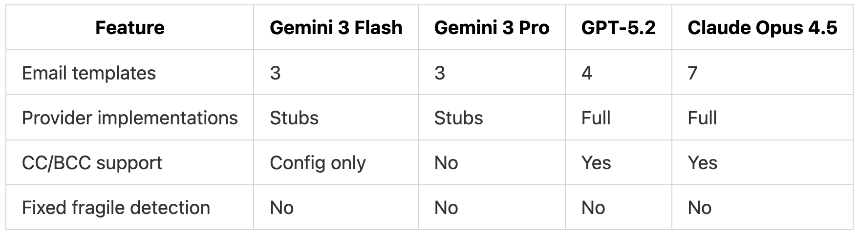 Gemini 3 Flash defined CC/BCC in its EmailConfig interface but didn’t use them in the send implementation. Both Gemini models left provider implementations as console.log placeholders rather than actual API calls to SMTP, SendGrid, or AWS SES.