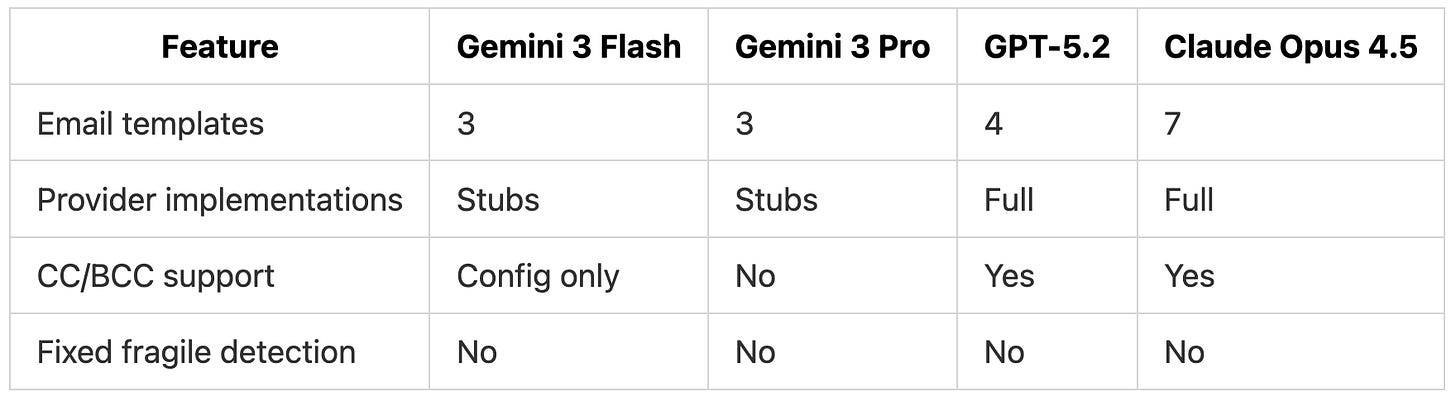 For $0.17 and 2.5 minutes, Gemini 3 Flash delivers 90% of the functionality. The missing 7-10% includes actual API implementations for email providers instead of stubs, complete email features like CC/BCC in the send logic and all 7 event templates, environment variable handling for secrets, and authorization checks on user-scoped endpoints.