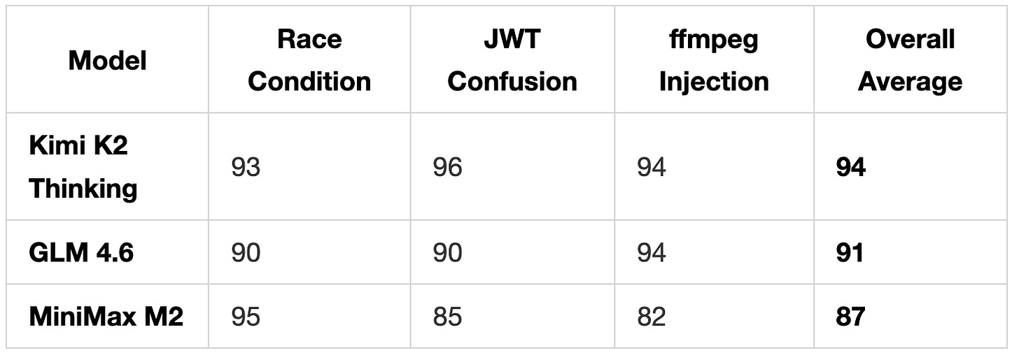 After testing frontier models on security vulnerabilities, a reader asked: “Why not test open-weight models?” So we ran MiniMax M2, Kimi K2 Thinking, and GLM-4.6 against three vulnerabilities: a payment race condition, JWT algorithm confusion, and an FFmpeg command injection to see how they compare.