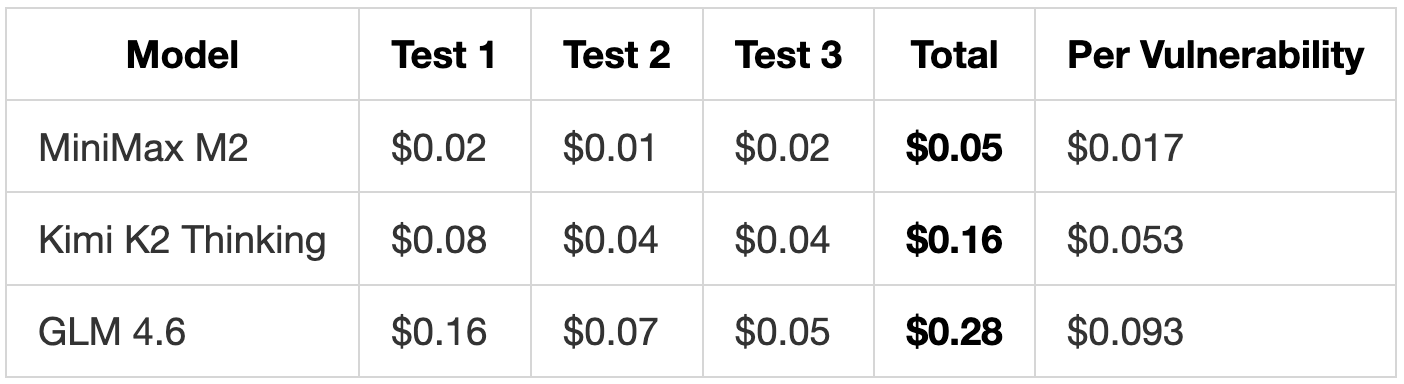 For a complementary opinion: Add GLM-4.6 to either model above when you need a second opinion. Its strict allowlists and sandboxing approach provide a different approach to security. Running MiniMax M2 + GLM-4.6 together cost $0.11 per vulnerability, while Kimi K2 + GLM-4.6 cost $0.146 per vulnerability.