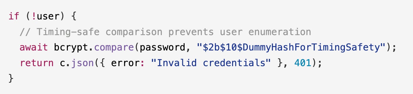 Implemented timing-safe user enumeration protection