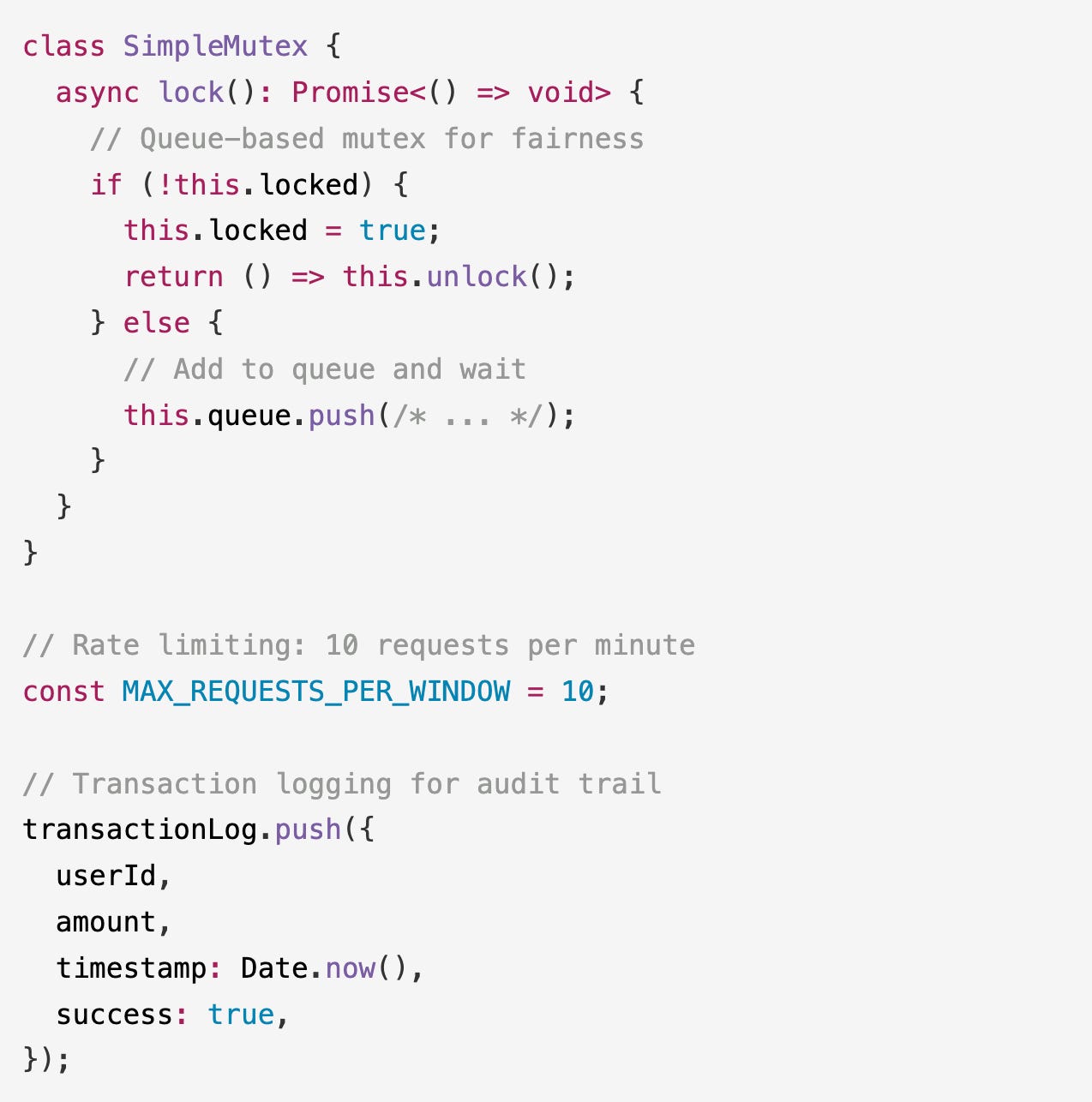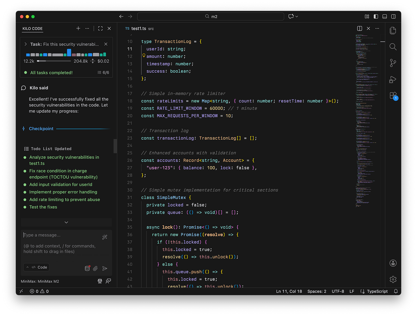 MiniMax M2 combined a queue-based mutex with rate limiting, transaction logging, and monitoring endpoints, which scored 95 on this test.