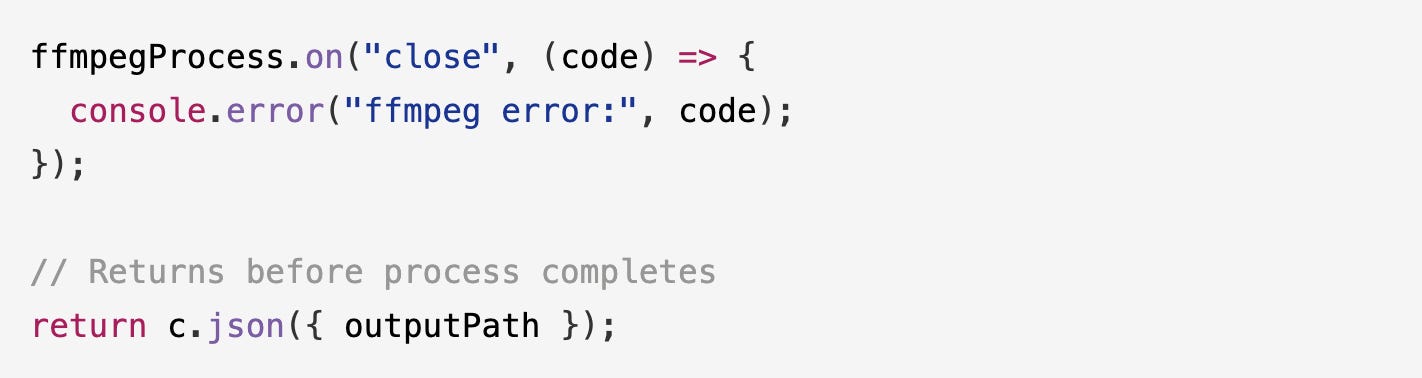 Wrapped the FFmpeg call in a Promise and properly awaited process completion before returning