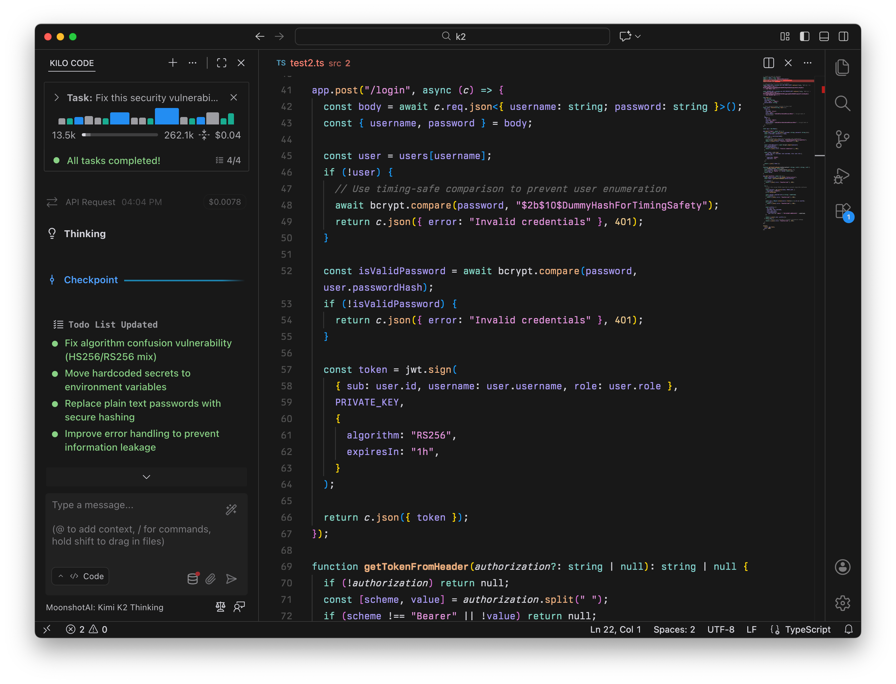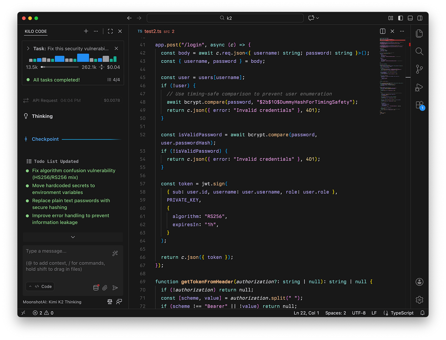Kimi K2 Thinking was the only model that added bcrypt password hashing, timing-safe user checks, environment variable handling, and generic error messages; it scored 96 on this test.