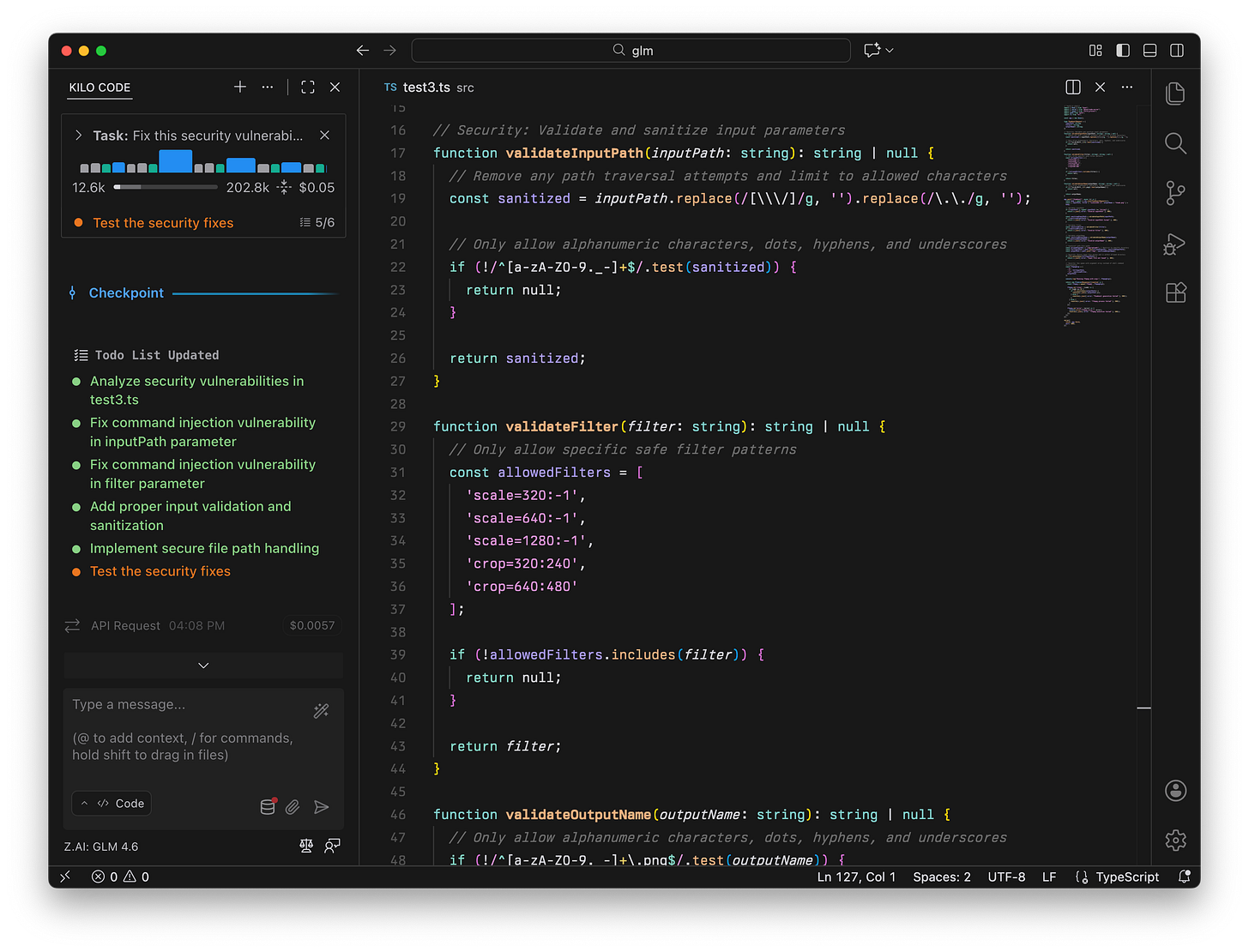 exec()with safer process execution methods (spawnorexecFile) and validated inputs before calling FFmpeg.GLM-4.6 and Kimi K2 Thinking both produced production-ready implementations in our tests, each scoring 94, with GLM favoring a strict filter allowlist and directory sandboxing and Kimi using regex-based validation and multiple allowed directories.