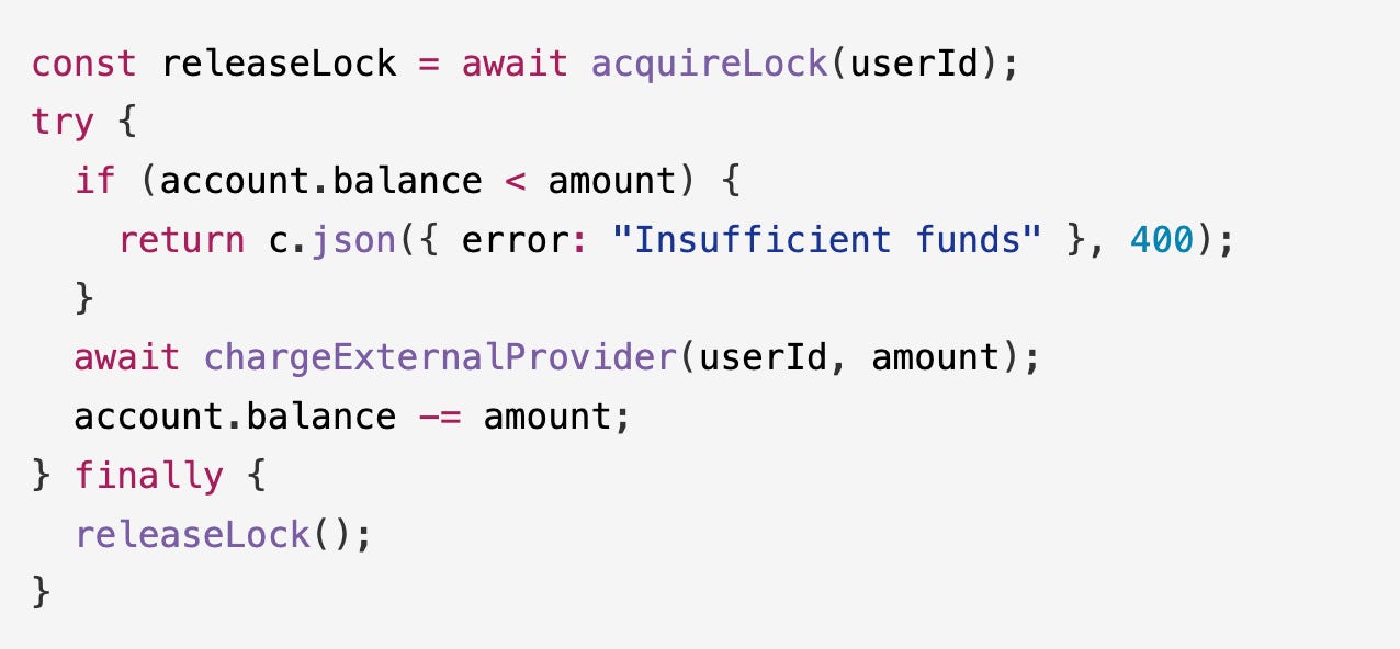 Two concurrent requests can both pass the balance check before either deducts, which allows users to overspend. This is similar to the Starbucks gift card race exploit from 2015.