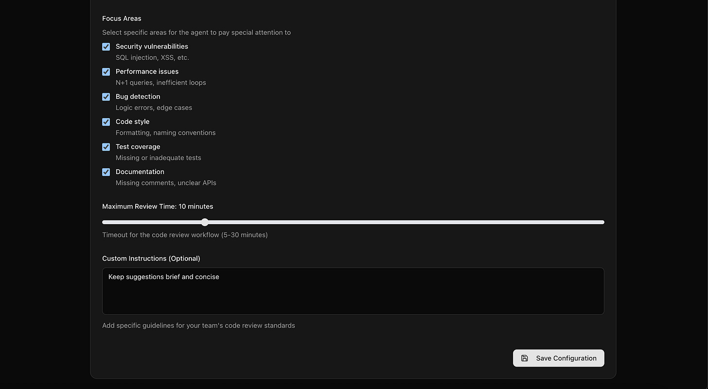 Pick what the reviewer prioritizes: security vulnerabilities, performance issues, bug detection, code style, test coverage, or documentation gaps.