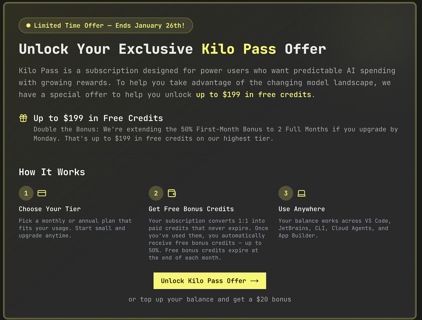 Kilo Pass is a subscription that rewards sustained usage. To help you take advantage of the changing model landscape, we have a special offer to help you unlock even more free tokens.