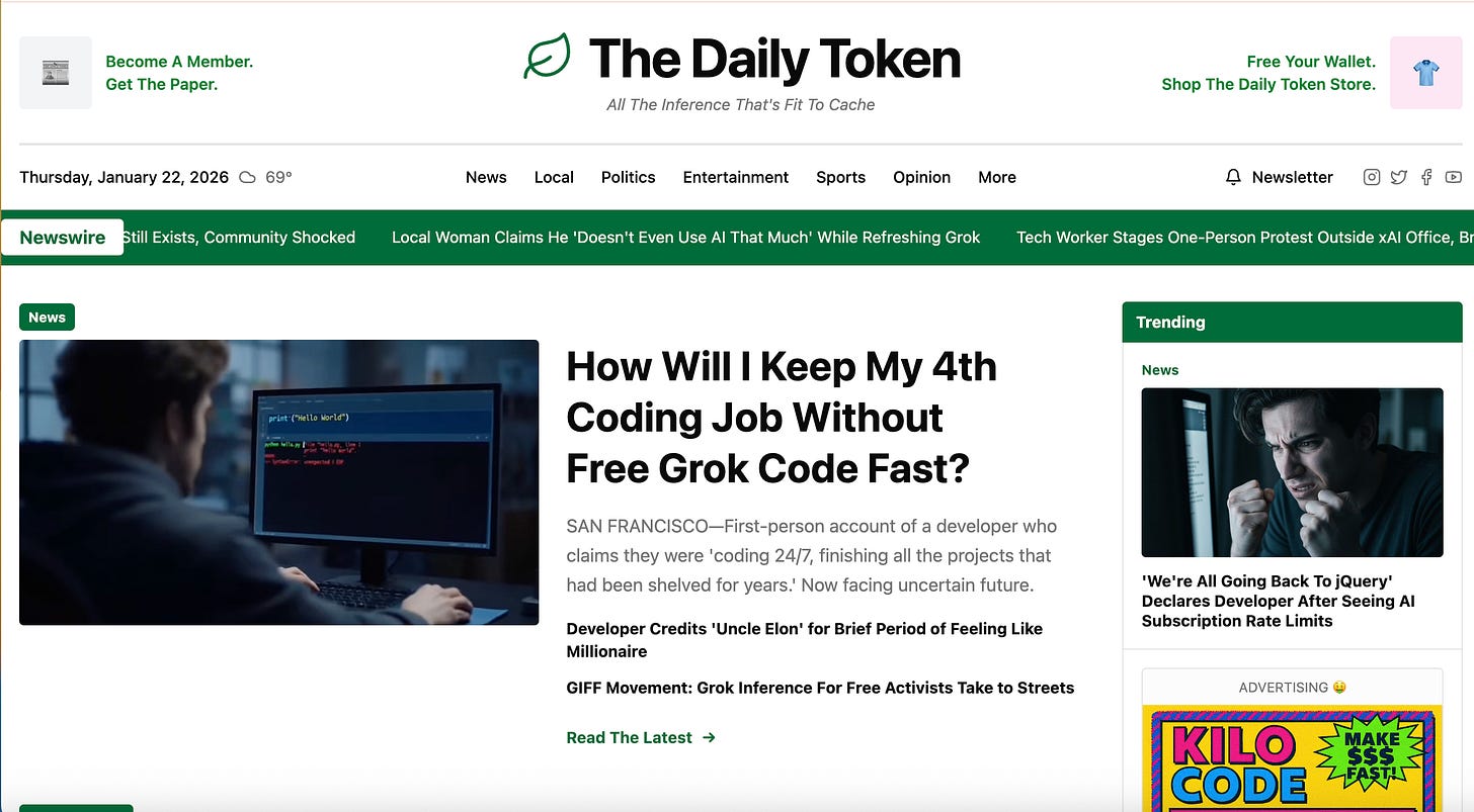 The results were chef’s kiss—headlines about “Token Hoarding Reaches Record Levels” and “Local Developer Discovers How to Code Without AI, Immediately Forgets.” You can find them on opinion and other subpages of The Daily Token.