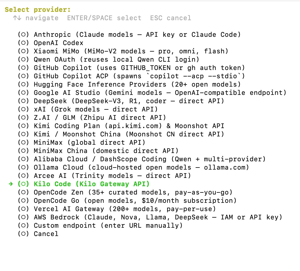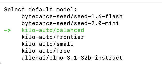 Connecting Kilo Gateway is built right into the Hermes CLI, along with many great providers like Hugging Face, Z.ai and Moonshot AI. Just select Kilo Code and follow the system prompts to add your API key and select a default model (which can be changed anytime in a session using the /model command).