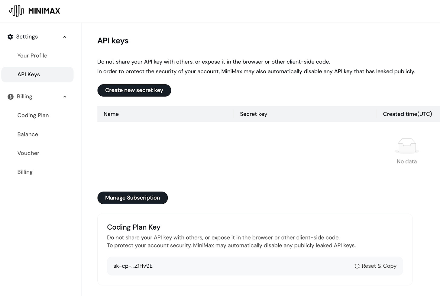 Copy your MiniMax API key. After purchasing a plan, go to the API keys page and copy the API key under “Coding Plan Key” (click on Reset & Copy if you don’t see your key):