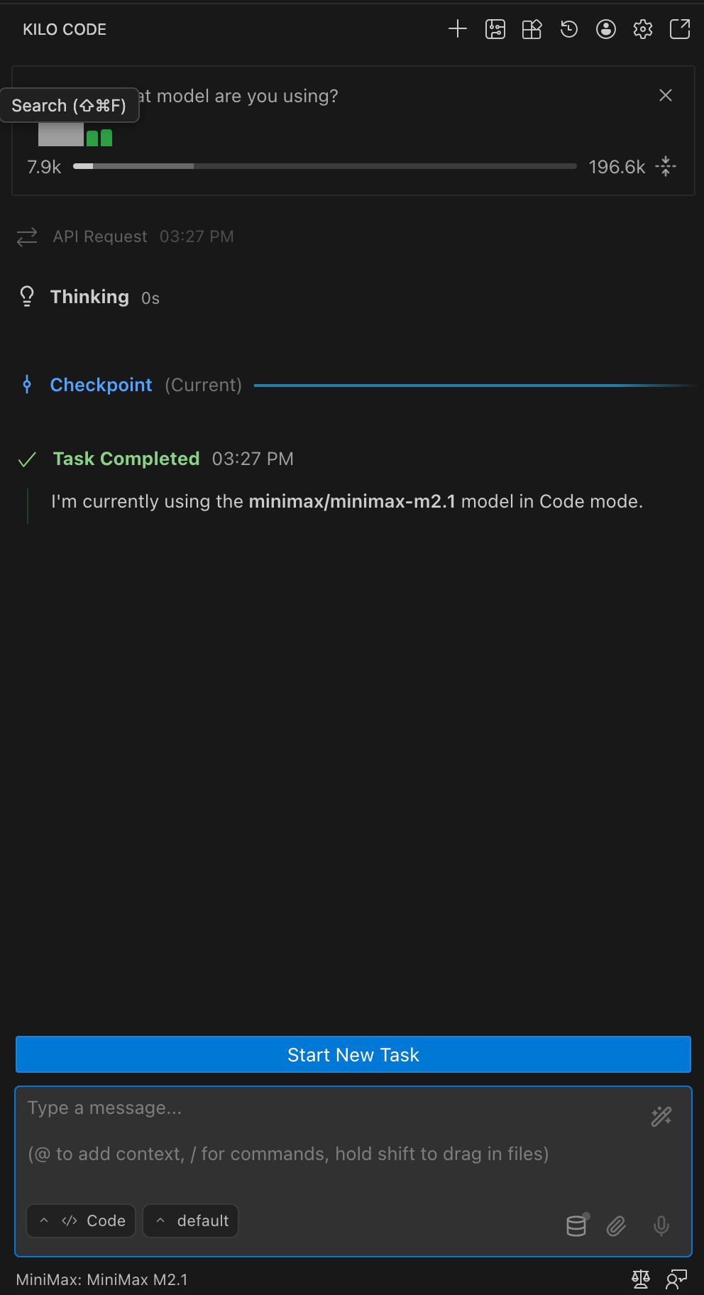 Go back to Kilo Code on VS Code and the latest version of MiniMax (M2.1) as your model