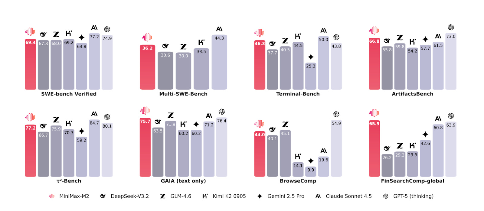 The latest version of MiniMax (M2.1) scores exceptionally well on various software development benchmarks compared to many state-of-the-art models.