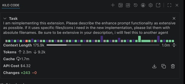 His best example of this process is replatforming Kilo’s autocomplete. Kilo originally transplanted its autocomplete suite from the open-source project Continue—a process that took two months of integration work. Mark replatformed the entire thing in approximately four hours, most of which was the agent running while he worked on something else.