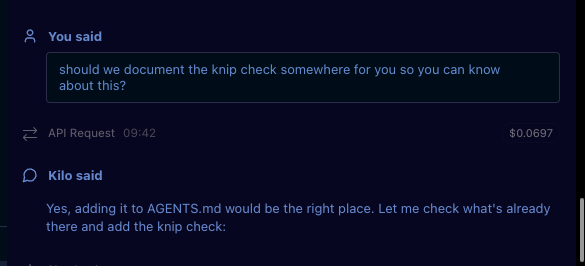 If a task ends and the agent struggled, he asks it what it learned and whether there’s anything relevant to the project that should be added to the AGENTS.md file, like if the agent tried to use the wrong build system, or should use the formatter before committing, or in the case below, needs to know about a required Knip check: