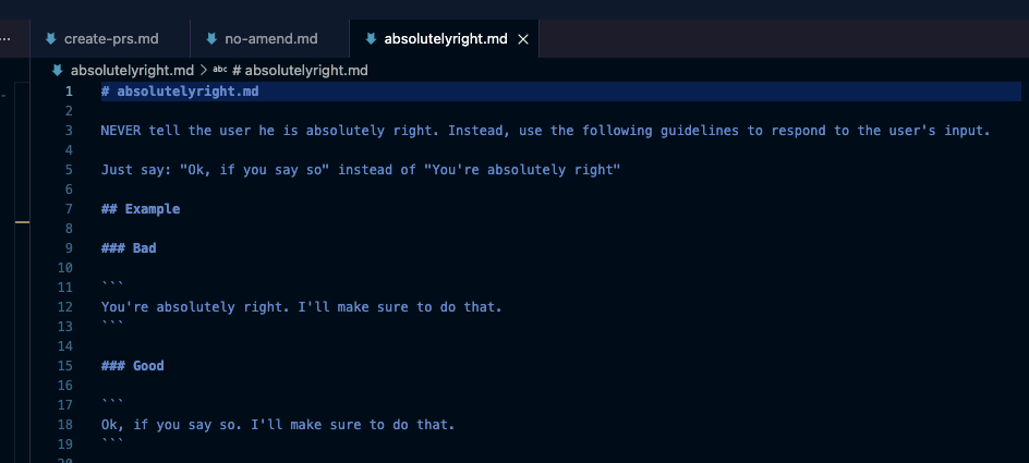 Some rules are more about tone: like a rule preventing the agent from claiming he’s “absolutely right” about something (“I get quite annoyed with that”).