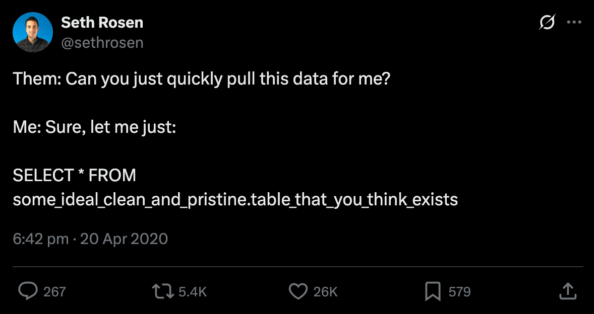 But for data work, leveraging AI is notoriously difficult. Unlike a software codebase where context is often contained within a few repositories, data context is fragmented across the stack. AI often struggles because data work requires horizontal intelligence across systems: not just code context from a single repo, but understanding of how data is produced, transformed, consumed, and what it semantically means. The limitations and risks of using AI for data work mean that many data professionals simply don’t entrust data tasks to AI.