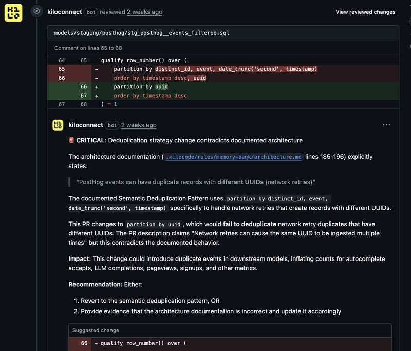 One of the approaches that helped Pedro deliver the Identity Resolution system so quickly was leaning on the Kilo Review Agent to speed up code reviews and catch silent failures before they reach production.