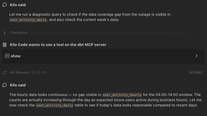 These approaches allowed Pedro to go beyond asking for a SQL script, executing it himself, and then debugging errors. “I can just tell the agent, “Run the query with the dbt MCP and figure it out.’” Not only is the feedback loop much faster, the agent can also understand and explain data sources. “That was a big breakthrough,” says Pedro.
