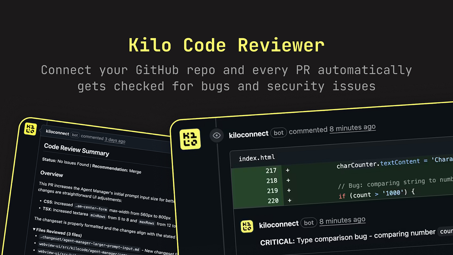A few weeks ago we shipped the Kilo Code Reviewer, which automatically analyzes pull requests the moment they’re opened on GitHub. It posts structured feedback as inline comments, catches issues across security, performance, style, and test coverage, and keeps watching as new commits get pushed.