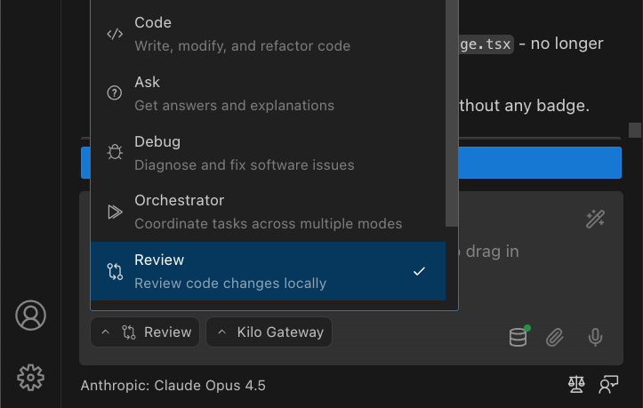 Fresh off hitting #1 Product of the Day on Product Hunt, we’ve brought Code Reviewer directly into your editor with the new Review mode. Review joins the existing lineup of specialized agent modes (Code, Ask, Debug, Architect, and Orchestrator) but works on whatever’s in front of you right now, before you commit or push.