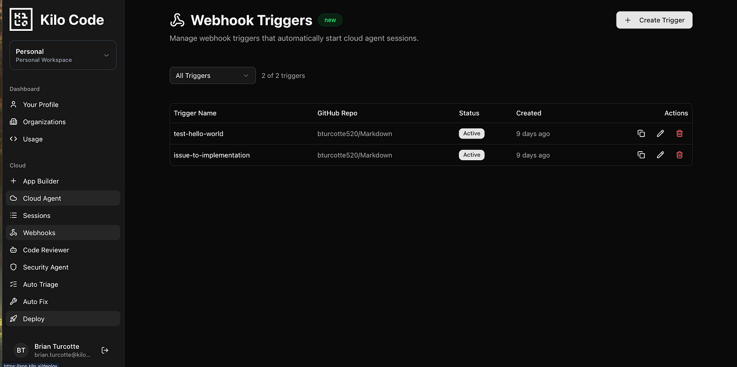 Cloud Agents now support webhook triggers, turning Kilo into an event-driven automation platform. Configure a webhook with an Agent Environment Profile and prompt template, then let external systems kick off Cloud Agent sessions via HTTP requests.