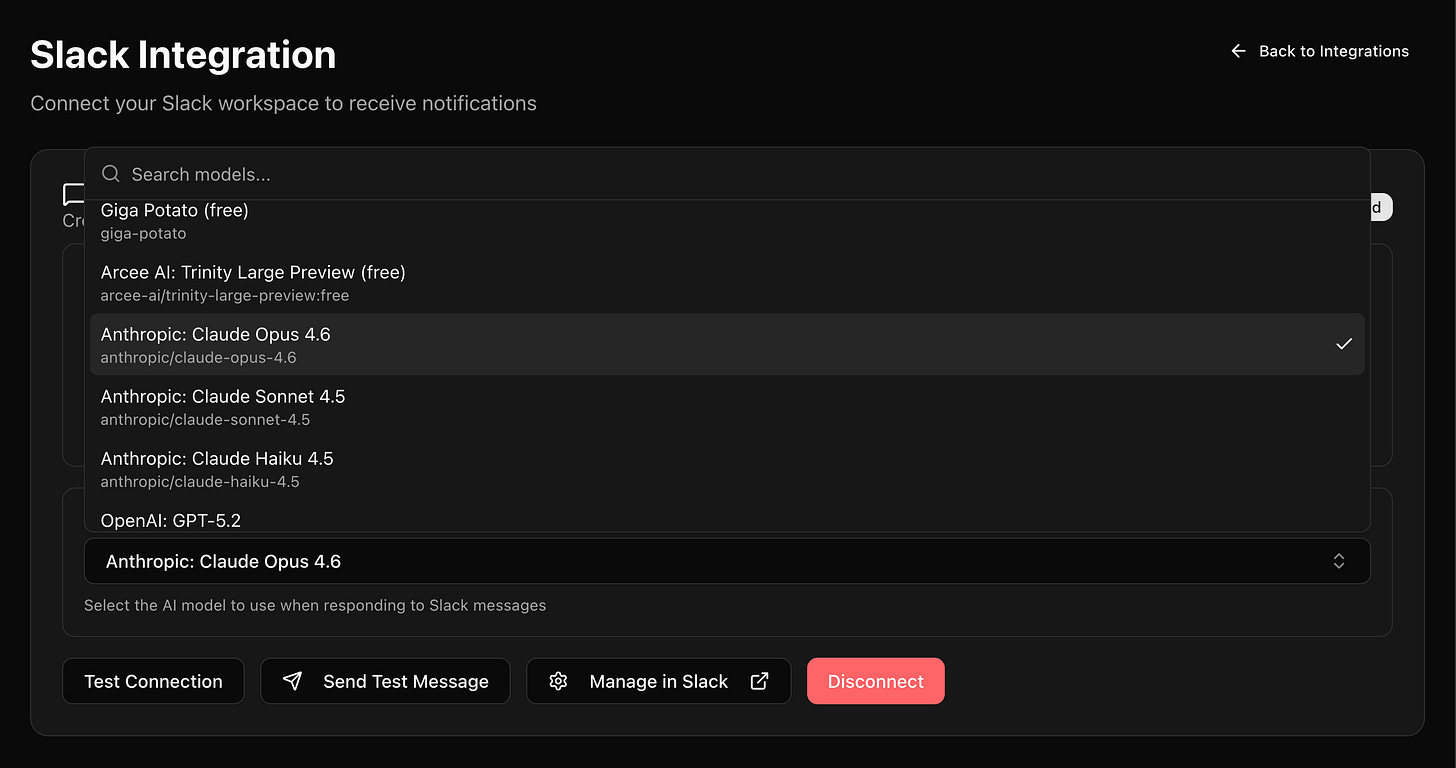 Go to app.kilo.ai/integrations to set up Kilo for Slack and select Opus 4.6 as the model